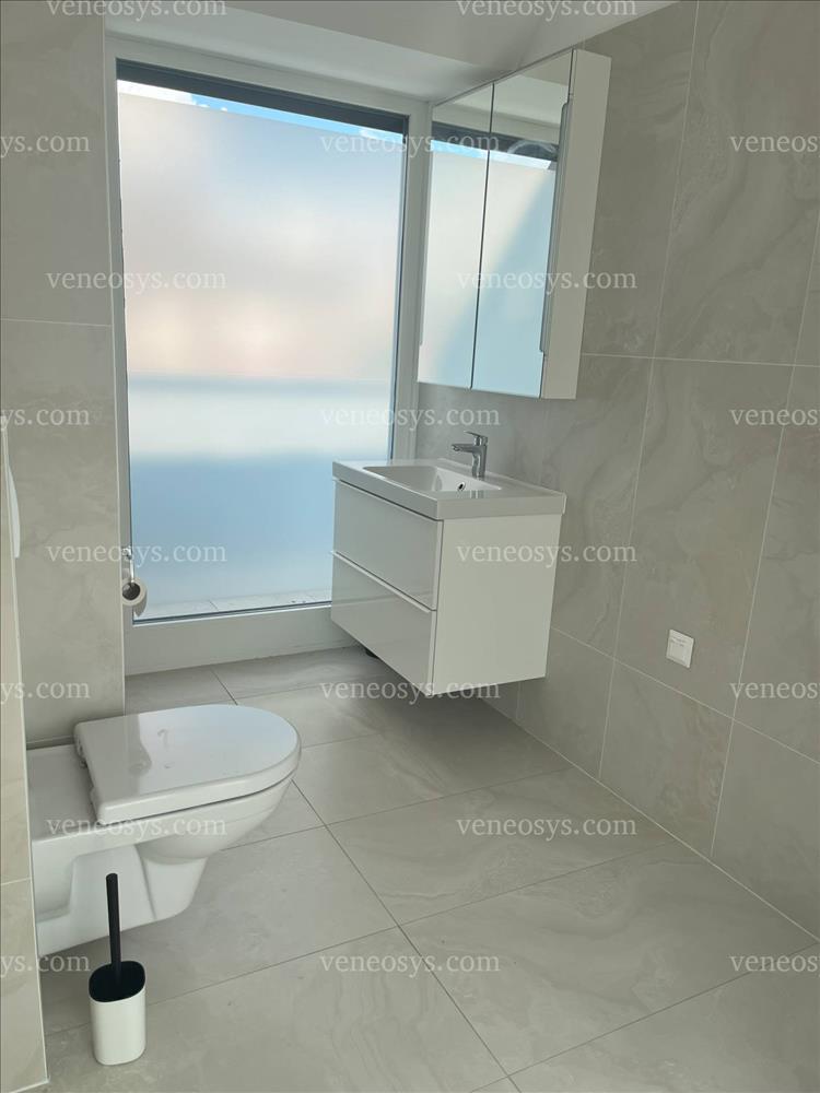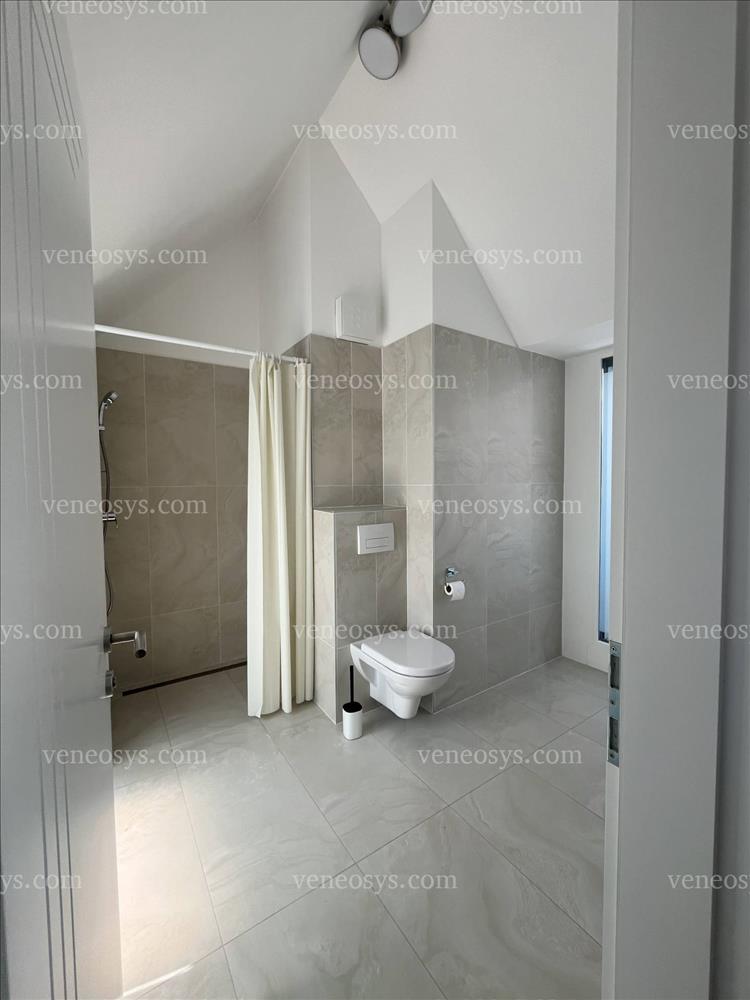 - Burkolatok, szaniterek: Vizes helyiségekben nagy méretű dekoratív bézs gres lapok, Grohe csaptelepek, zuhanytálca, Laufen wc és mosdó. Német minőségű Parador Loft szériájú 2200x243x9mm prémium laminált padló.