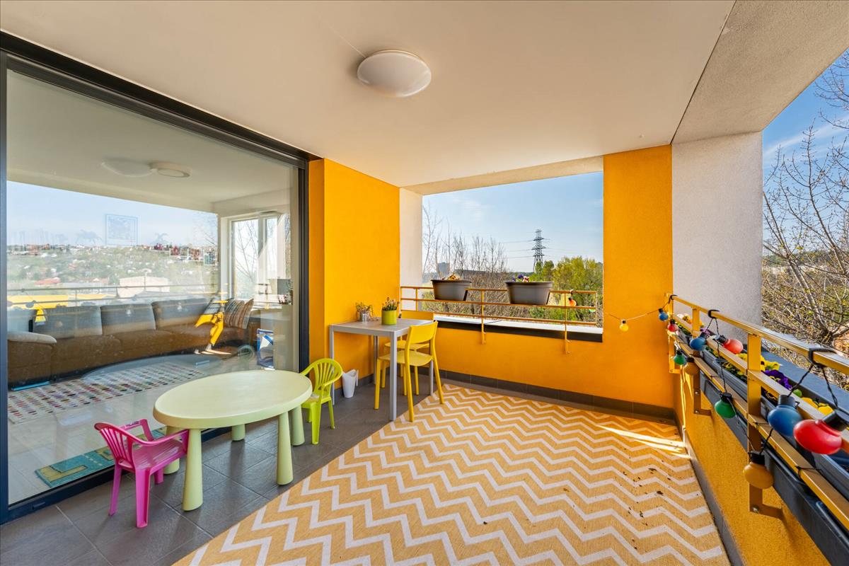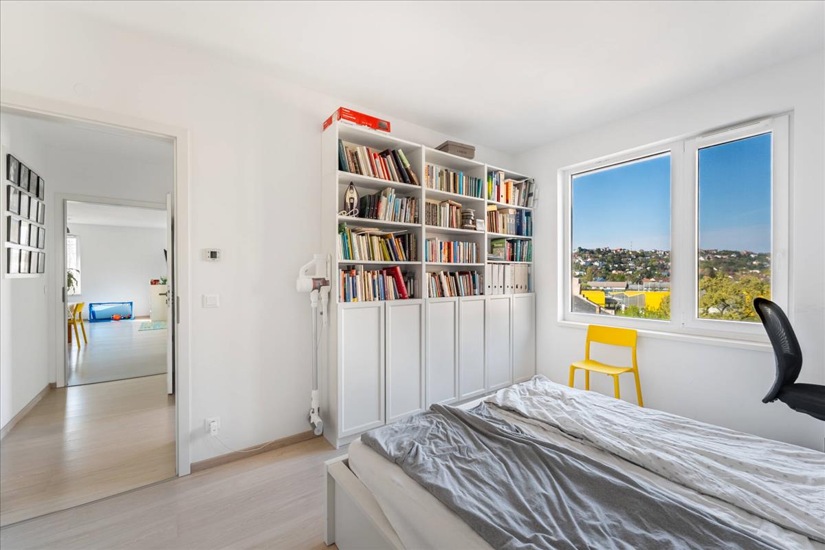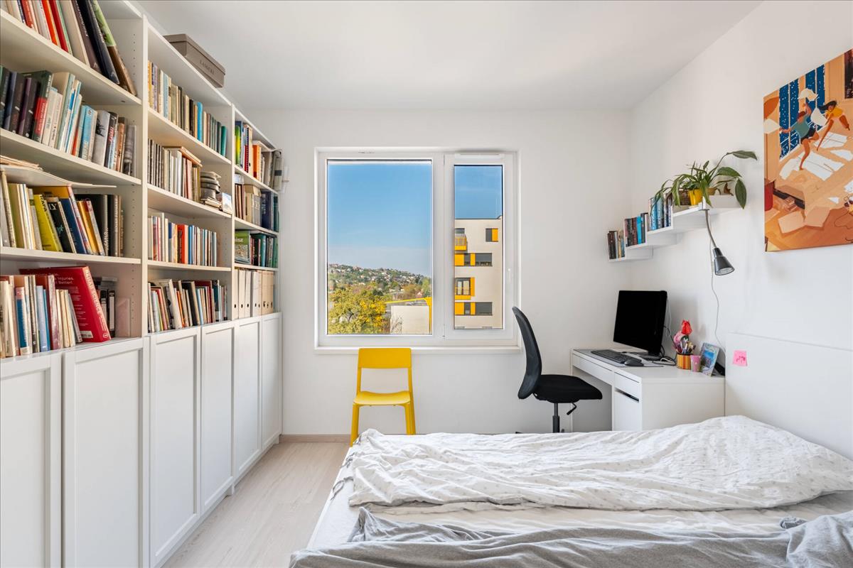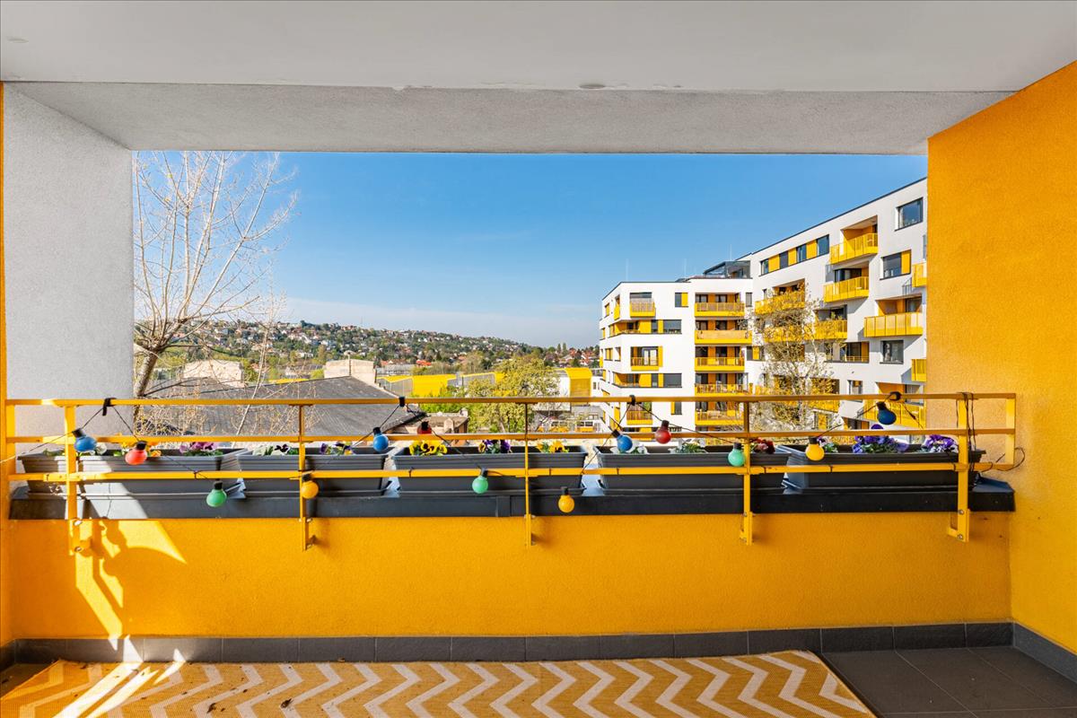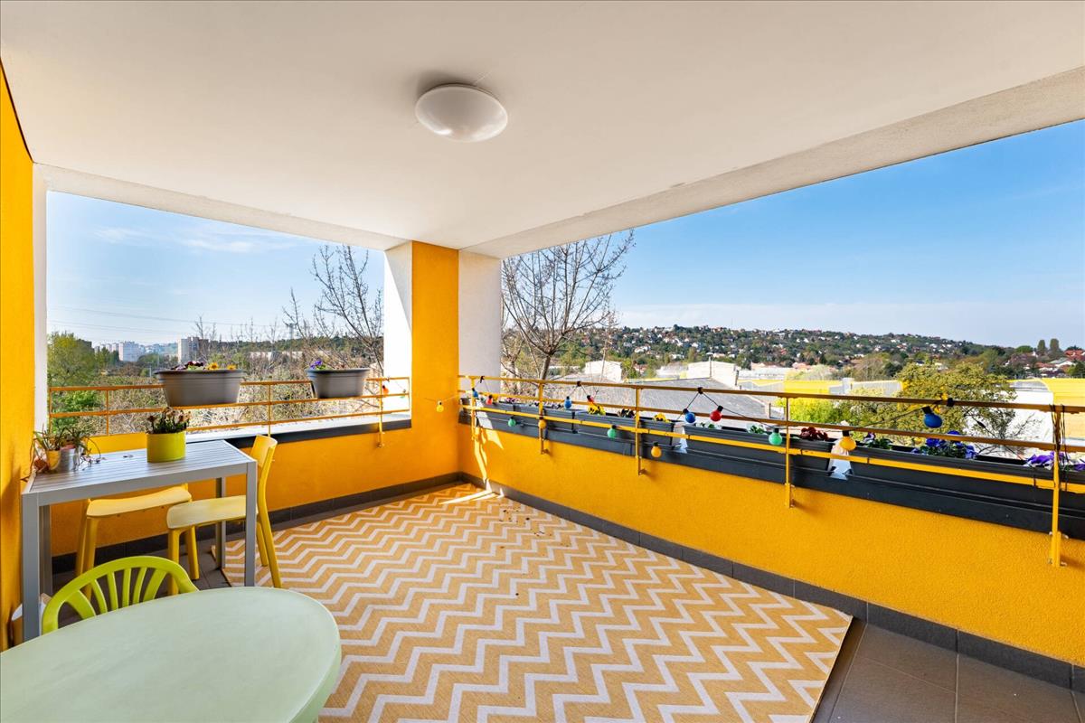 A nagy üvegfelületeknek és az 5. emeleti elhelyezkedésnek köszönhetően rendkívül világos, a fedett loggia pedig egész évben élhető plusz teret ad, ráadásul páratlan kilátással a Budai hegyek irányába.