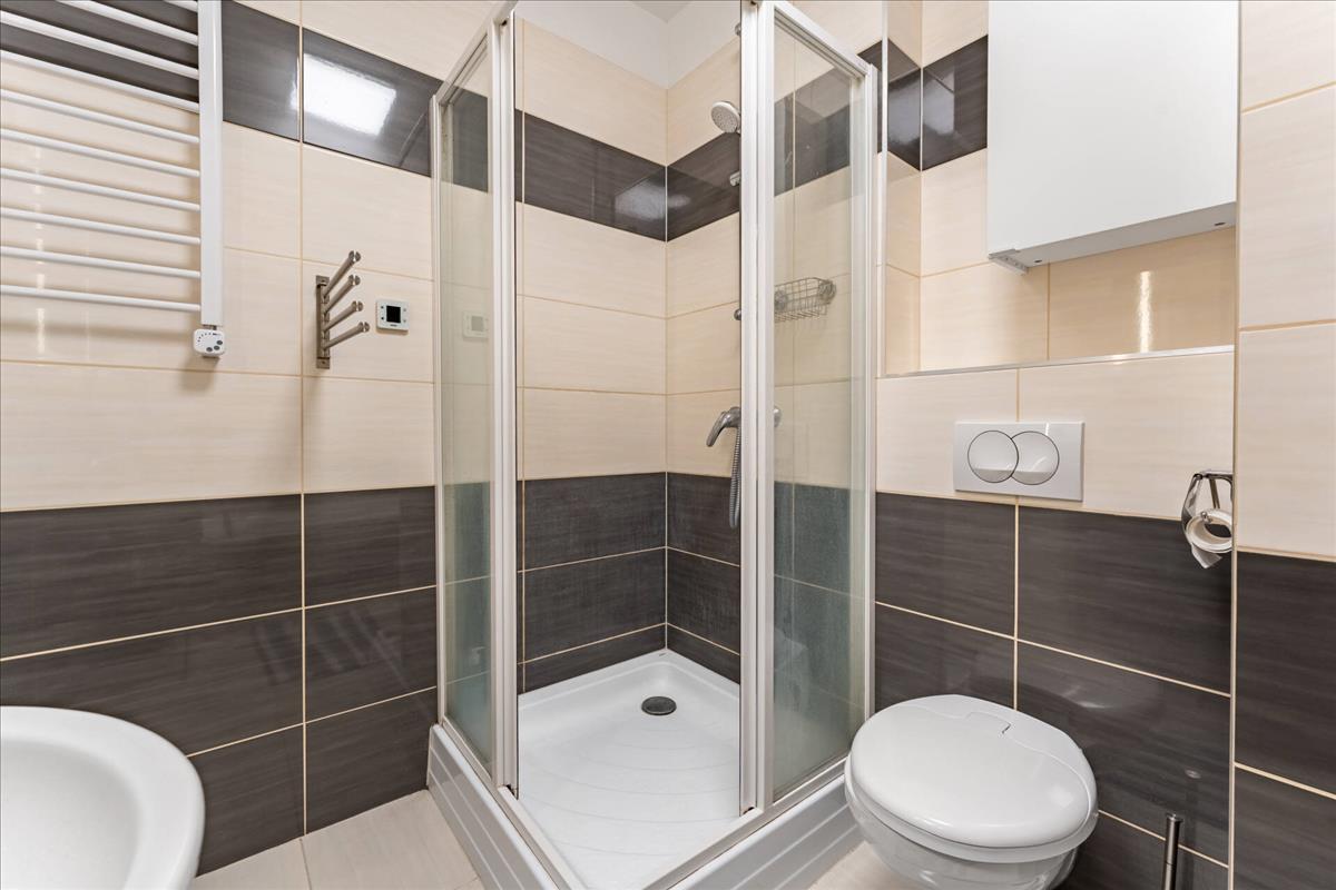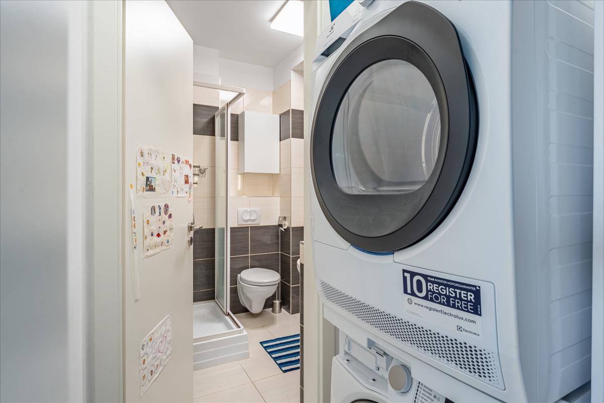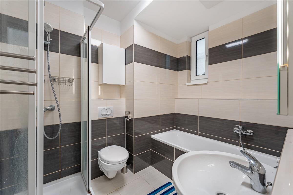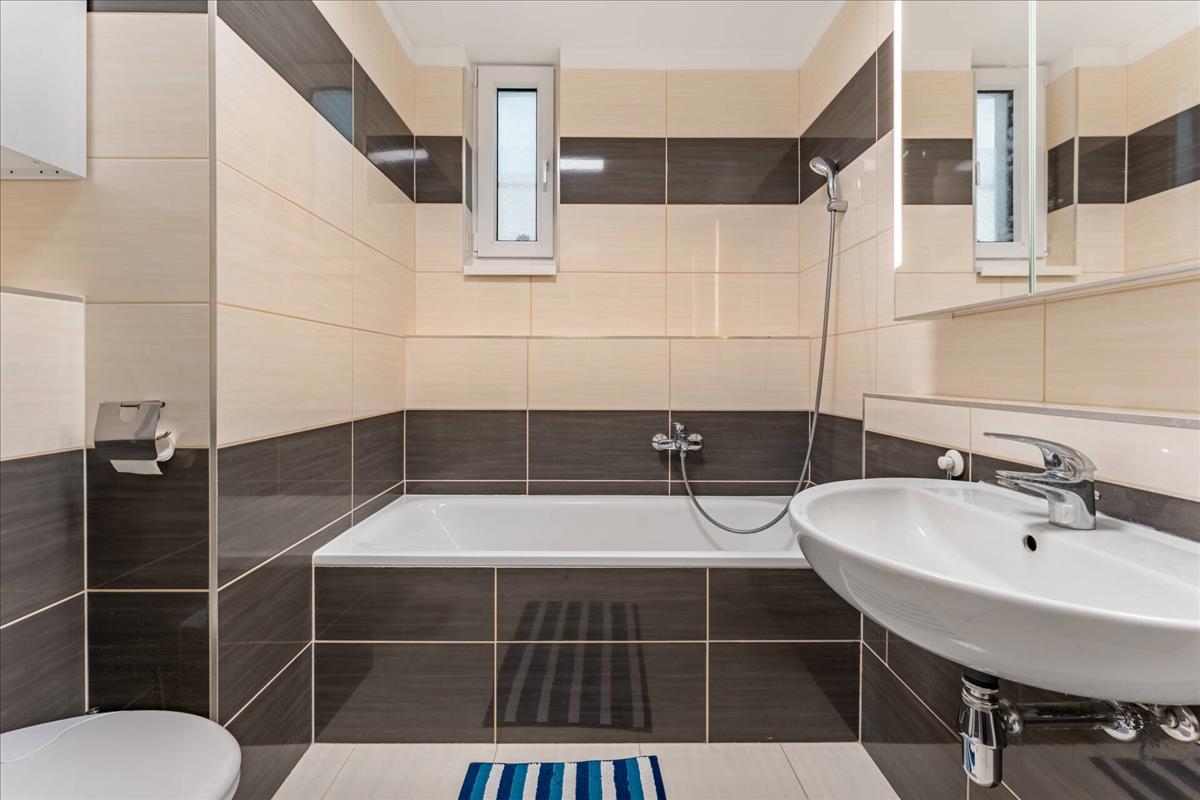A fürdőszoba praktikus módon zuhanyzóval és káddal is felszerelt, ami ritka és kifejezetten értéknövelő megoldás.