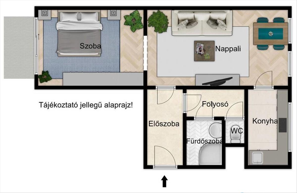 A két szoba praktikus elrendezést biztosít, a beépített, 4 m²-es erkély pedig plusz életteret ad – tökéletes dolgozósaroknak vagy pihenőkuckónak.