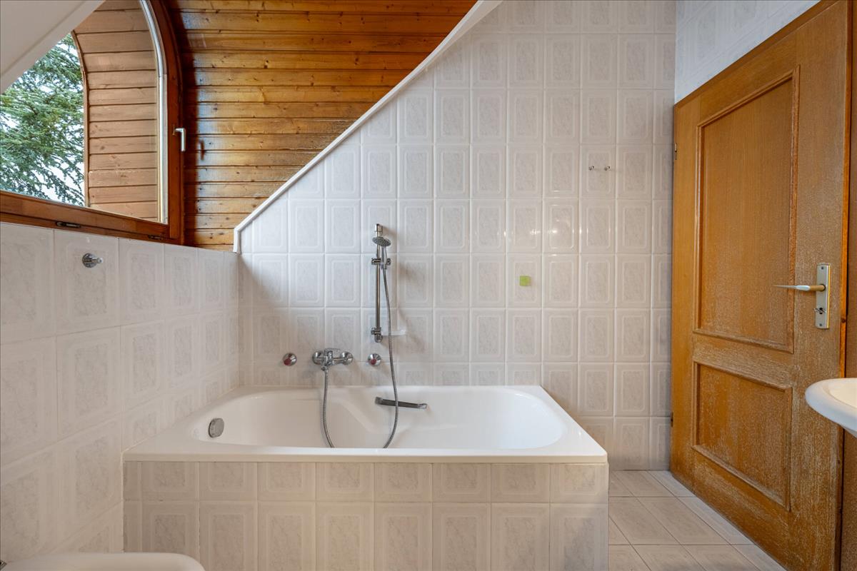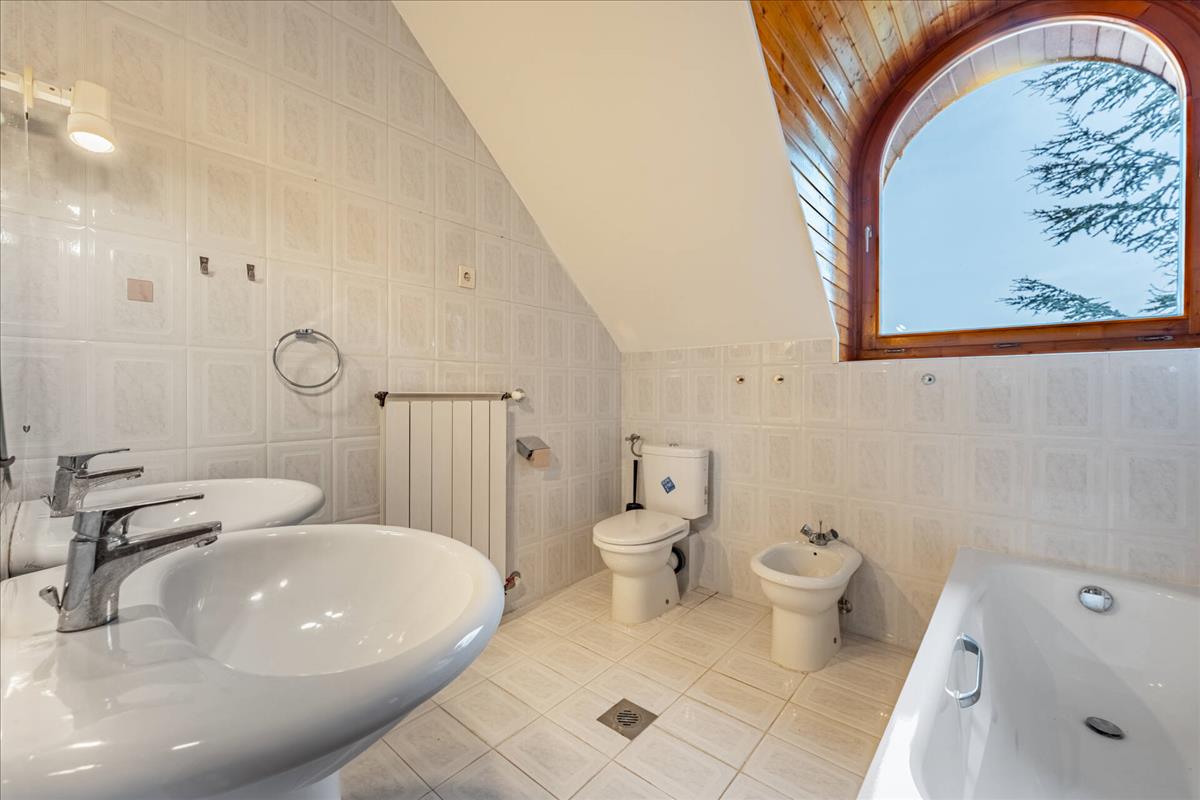 Az emeltre felérve van két fürdőszobánk, jelenlegi kialakításban pedig két hálószobánk, mely egyik egy sétáló gardrób szobával egészül ki.