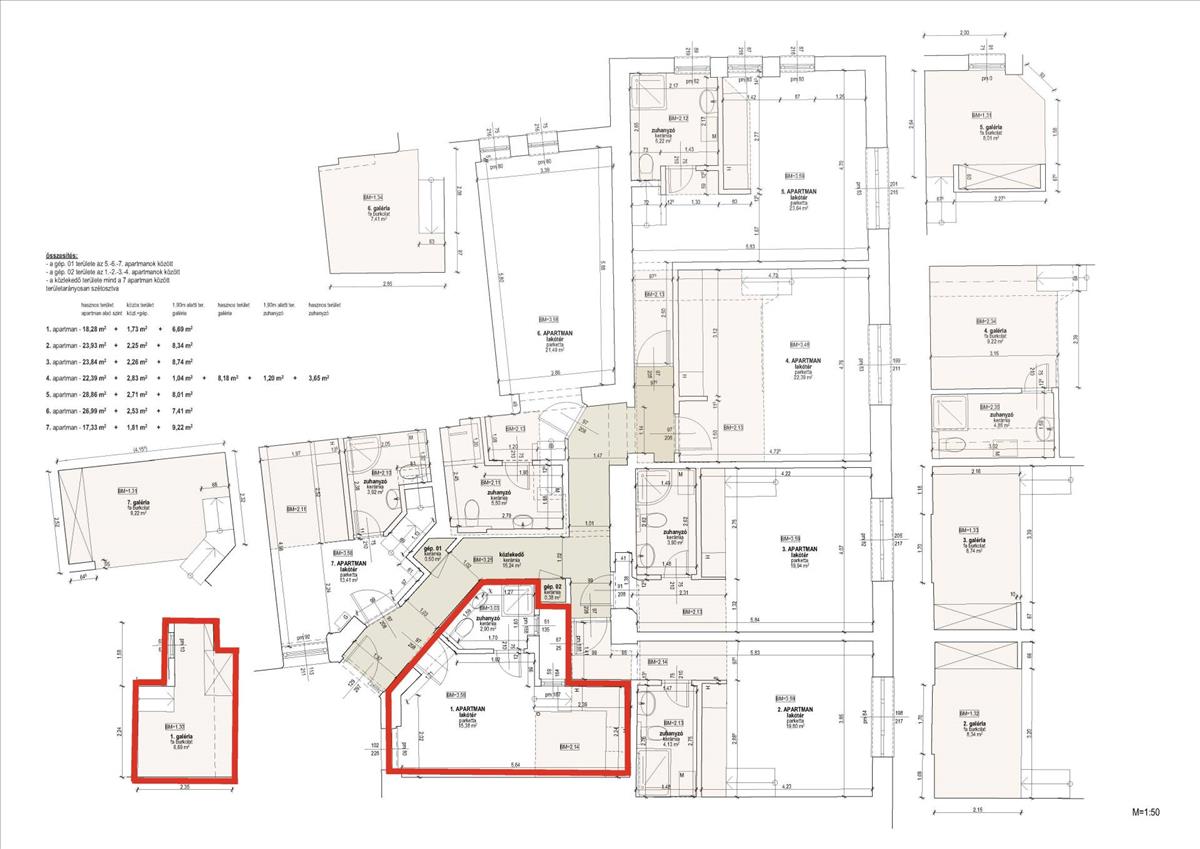Az ingatlan tehermentes, osztatlan közös tulajdon, ügyvédi megosztással, két nagyobb lakásból kialakított, összesen hétlakásos kialakítás részeként jött létre, az alaprajzon pirossal jelölve egyértelműen beazonosítható, hogy pontosan melyik lakás kerül értékesítésre.