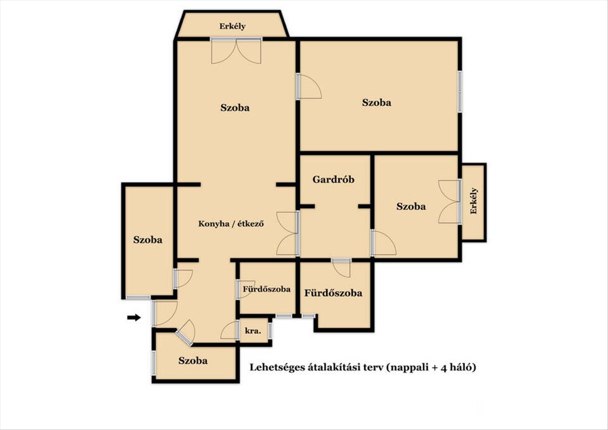 Az alaprajz további lehetőségeket rejt magában. Az ablakos konyhából van lehetőség plusz egy szobát kialakítani, a konyha pedig kényelmesen elfér a jelenlegi étkező helyén.