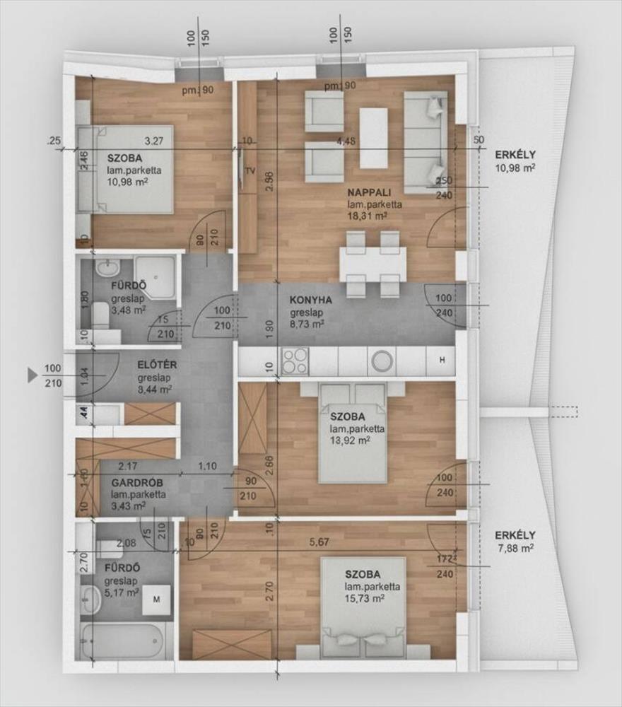Az ingatlan helyiségei: előszoba, amerikai konyhás nappali (27, 44 nm ), 3 szoba ( 10, 98 nm , 12, 22 nm és 15, 73 nm ), 2 fürdőszoba, gardrob, 2 erkély.