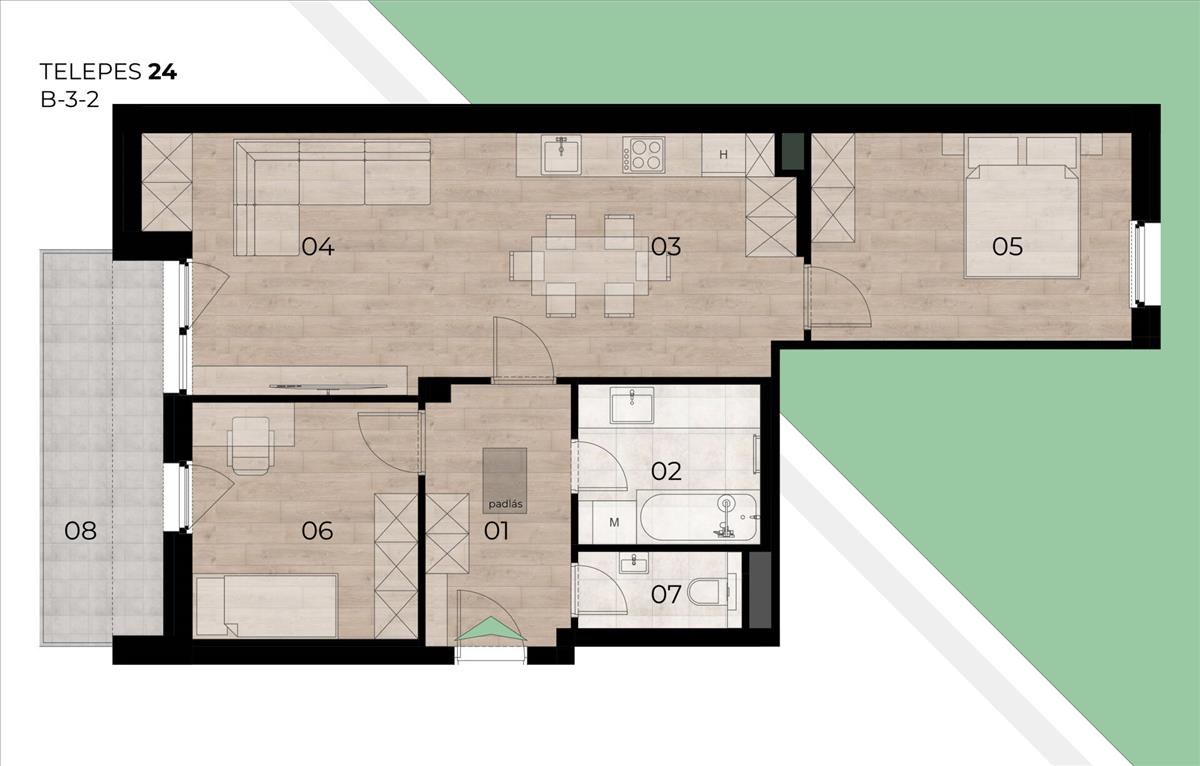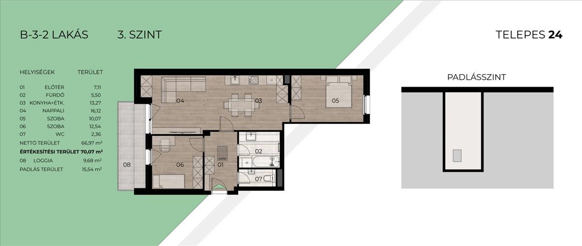 •Lakás adatai: B épület, 3. emelet – 70, 07 m² alapterület + 9, 68 m² erkély + 15, 54 padlástér