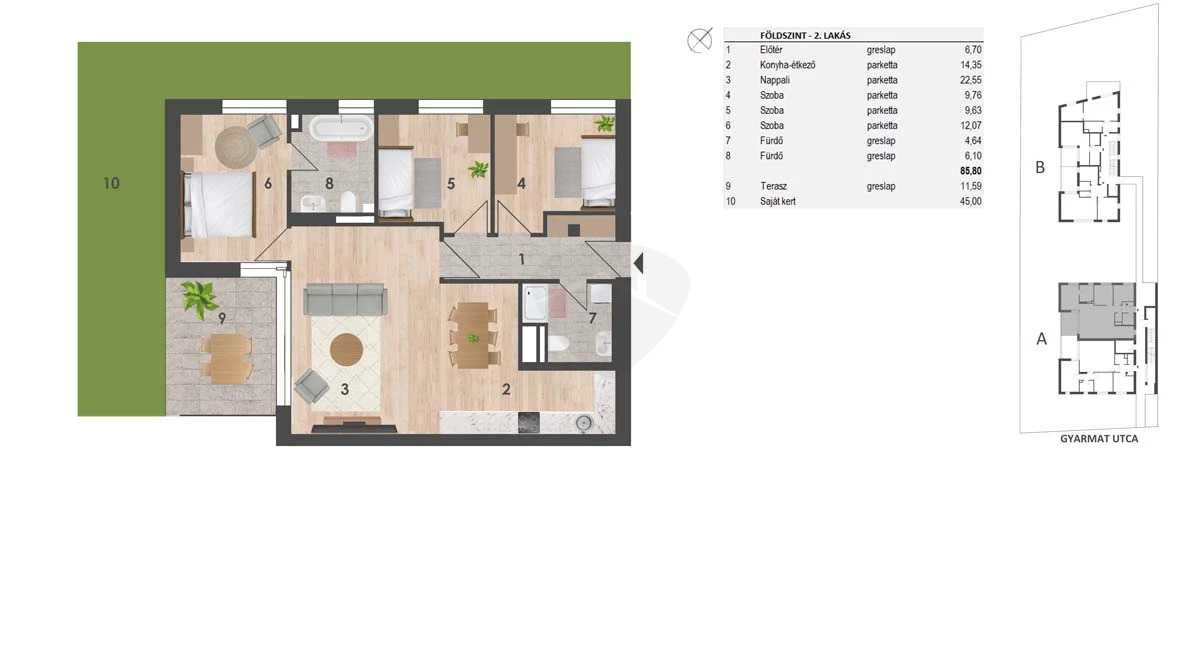 A földszinti lakások saját kerttel, az emeleti lakások erkéllyel vagy loggiával rendelkeznek.