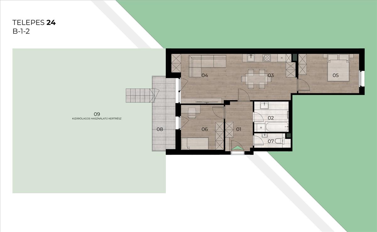 • Lakás adatai: B épület, 1. emelet – 70 m² alapterület + 9, 68 m² erkély + 137, 3 kizárólagos használatú kert.