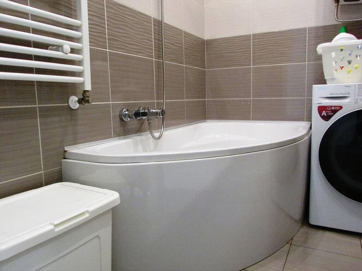 Fürdőszoba rendkívül tágas, fél sarokkád van betéve, több szekrény teszi kényelmessé a pakolást.
