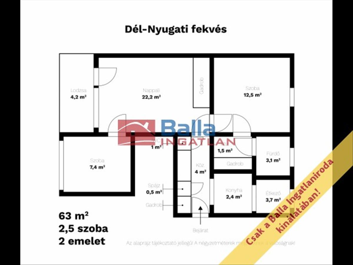 Az ingatlan 2. emeleti elhelyezkedésű, vegyes falazatú társasházban található, 63 m² alapterületű, 2, 5 szobás lakás, parkettázott helyiségekkel.