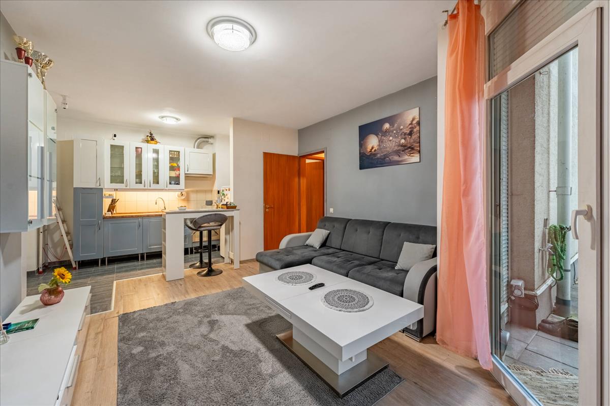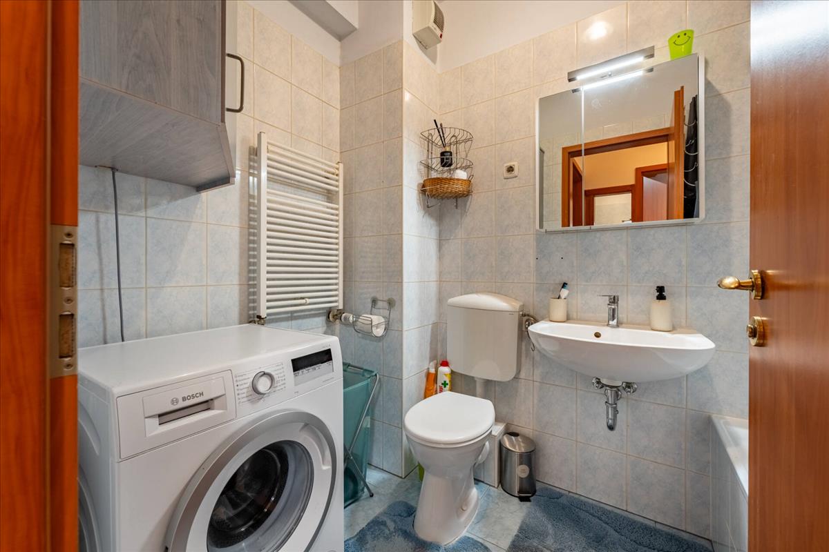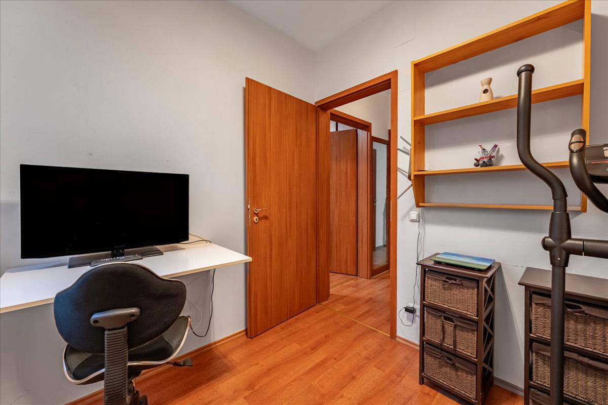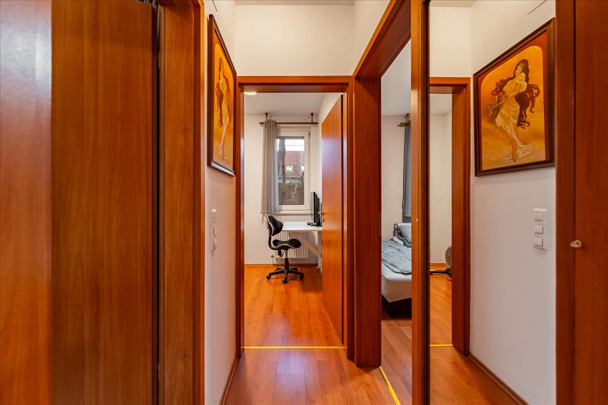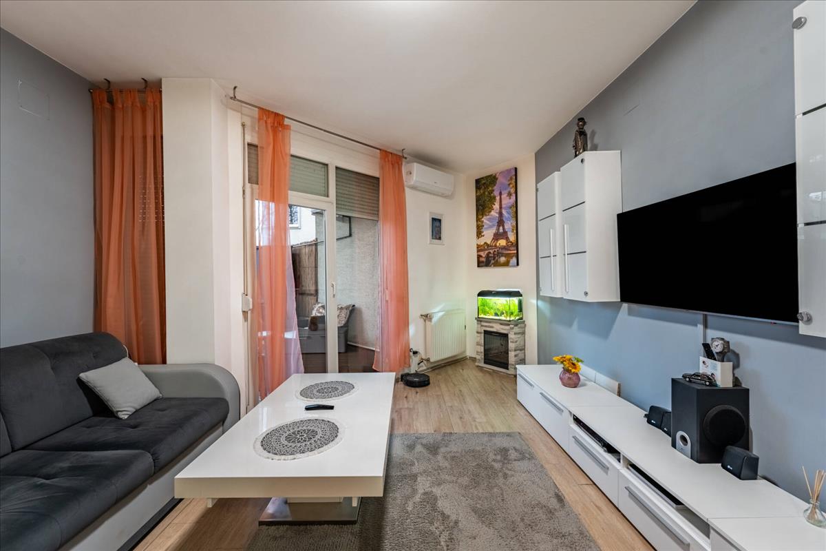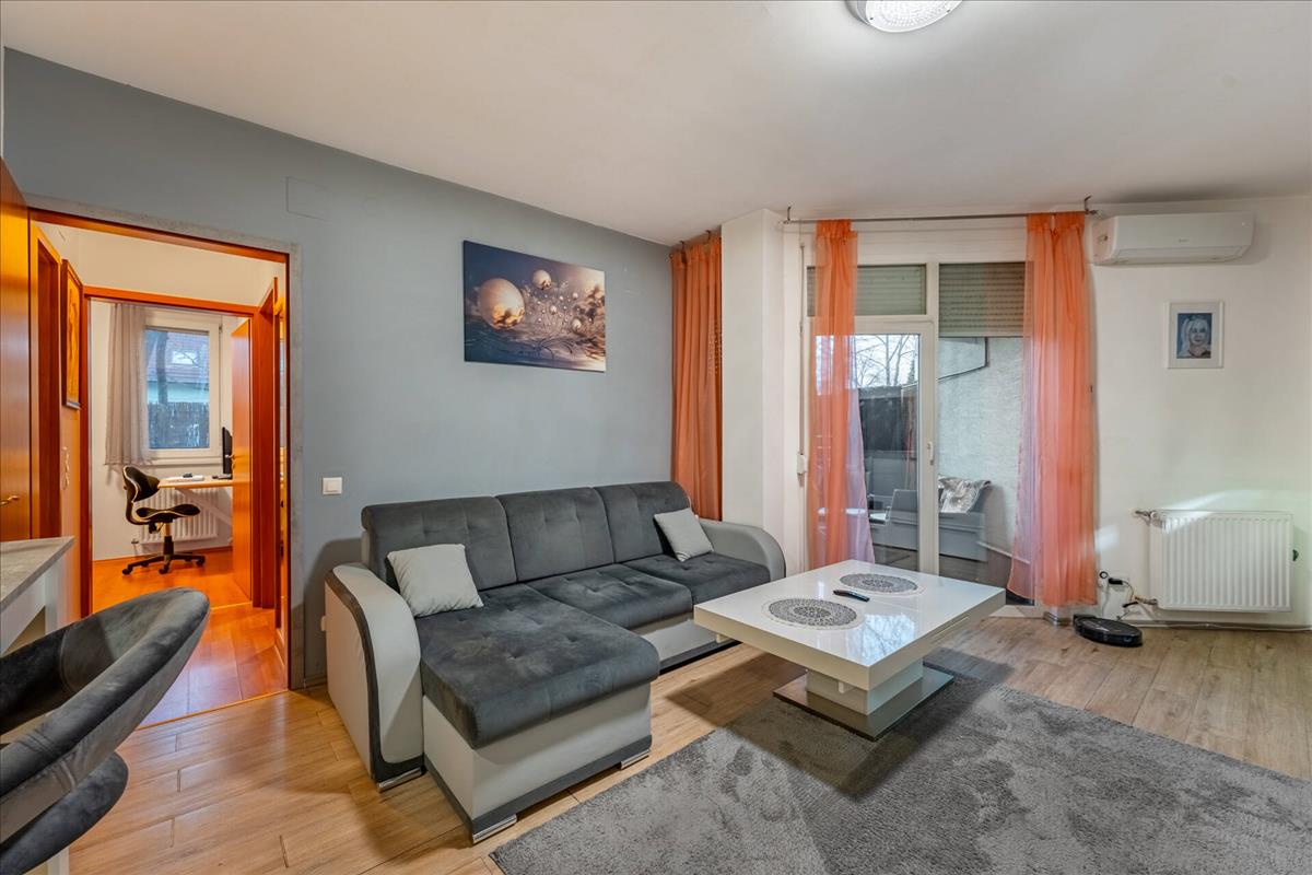 Ingatlanunk a földszinten található, melybe belépve a tágas amerikai konyhás nappaliba érkezünk, mely hűtő-fűtő klímával szerelt.A közlekedőn található a kádas fürdőszobánk, melytől karnyújtásnyira kapott helyet a hálószobánk, illetve gyerek/ dolgozó szobánk.