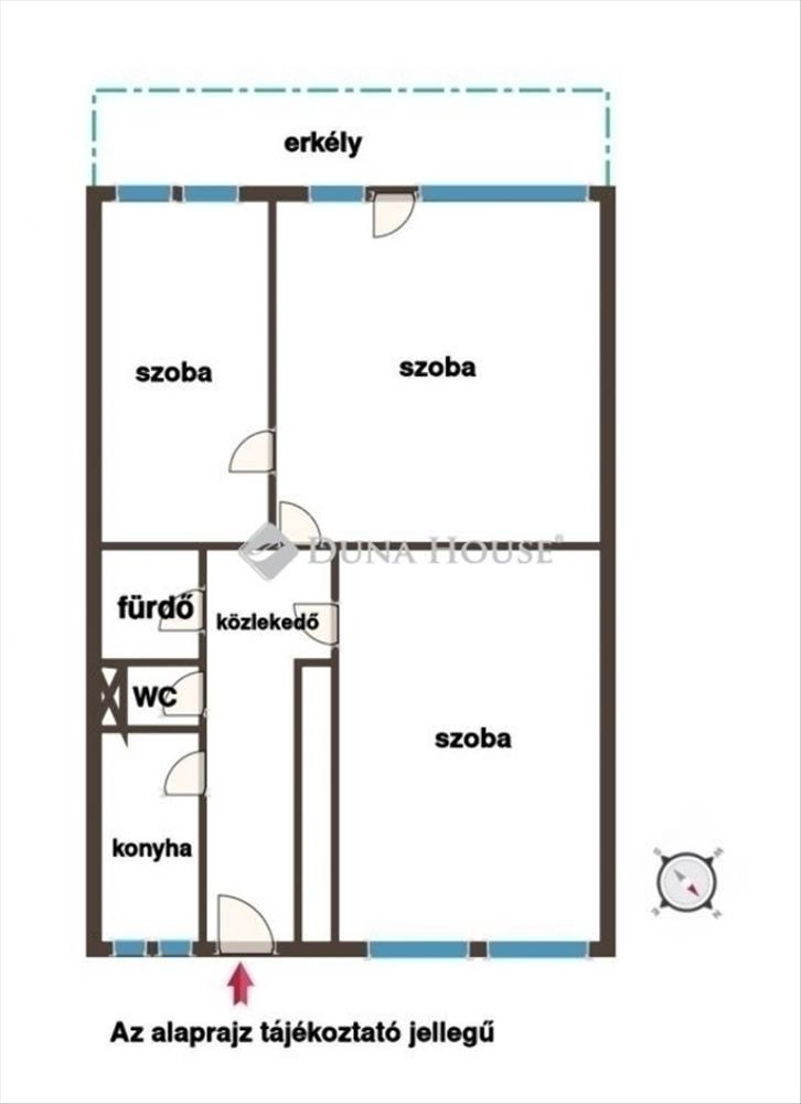 Az ingatlan helyiségei: nappali (17, 6 nm), szoba (13, 5 nm), szoba (10, 8 nm), konyha (6, 7 nm), fürdőszoba (3, 8 nm), wc (1, 3 nm), folyosó (8, 6 nm), valamint egy erkély (kb. 8 Nm).
