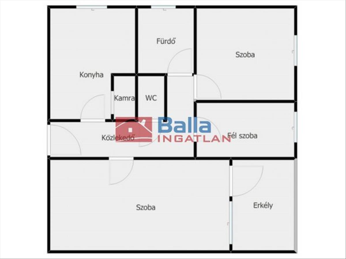 A lakás beosztása: közlekedő, konyha, kamra, 2 szoba, 1 félszoba, fürdőszoba, Wc, erkély.