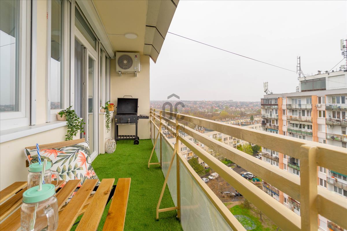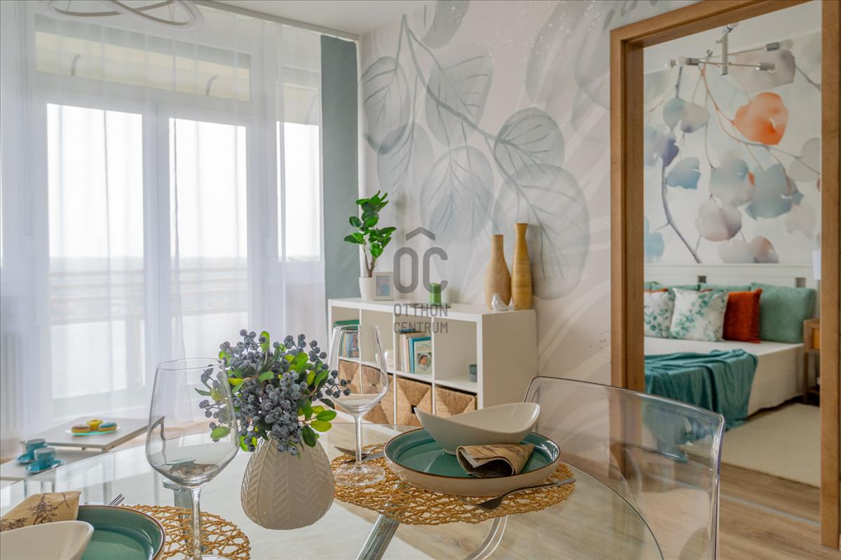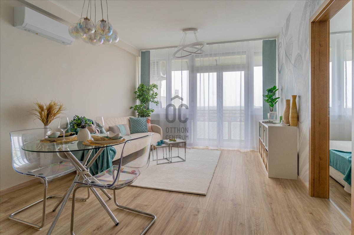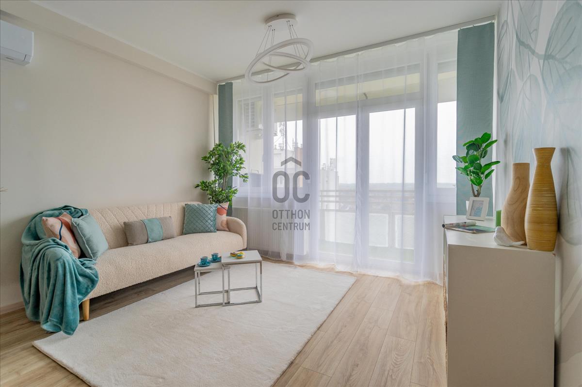 Eladó a 22. kerületben egy igényesen felújított, 45 nm + 8 nm erkélyes, 10. emeleti, 2 szobás csúsztatott zsalus lakás.