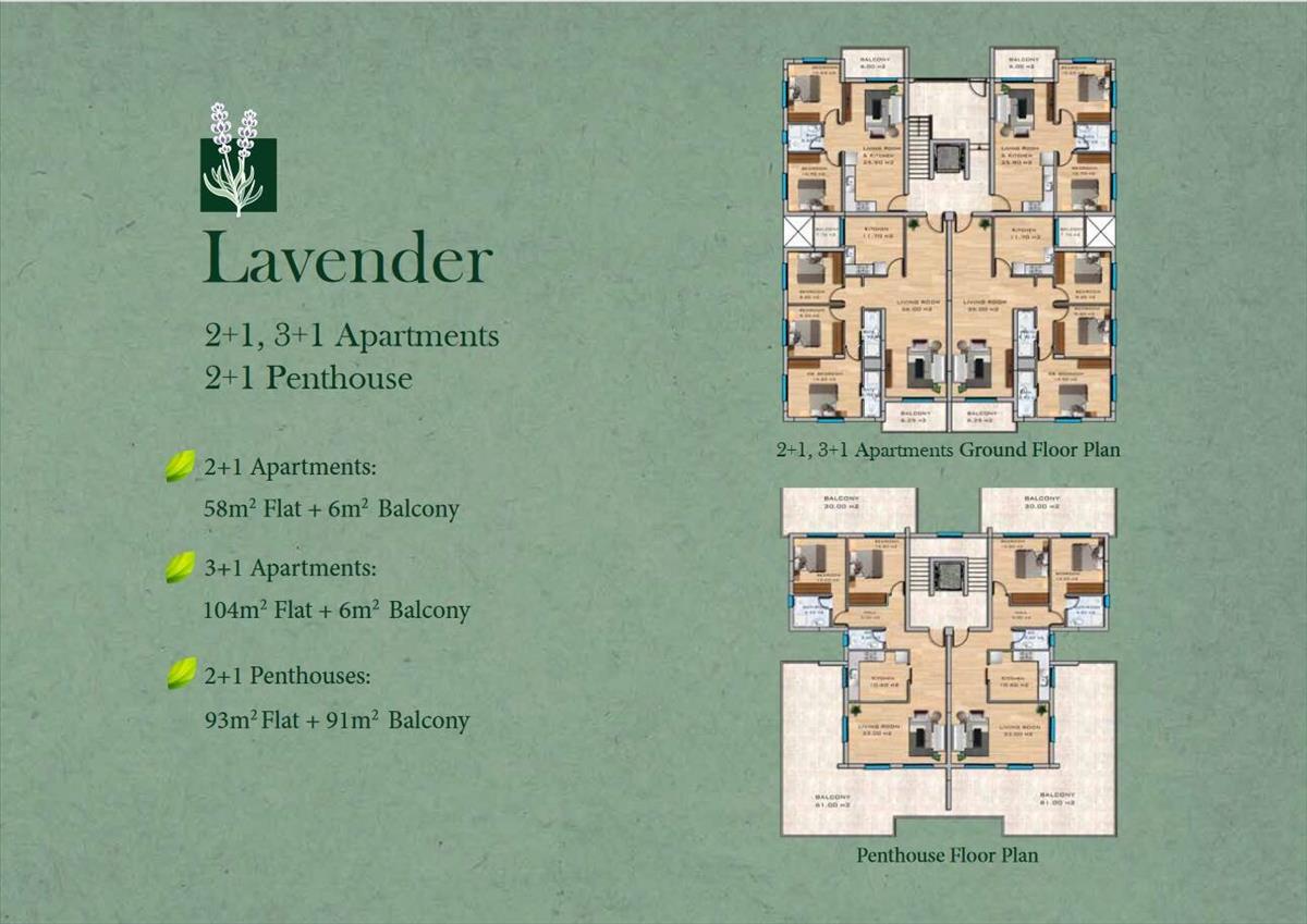 Levendula 2+1, 3+1 apartman 2+1 penthouse 2+1, 3+1 apartmanok földi terve Penthouse alaprajz 2+1 apartman: 3+1 apartman: 2+1 penthouse: 58m2 lapos + 6m2 erkély 104m2 lapos + 6m2 erkély 93m2 lapos + 91m2 erkély