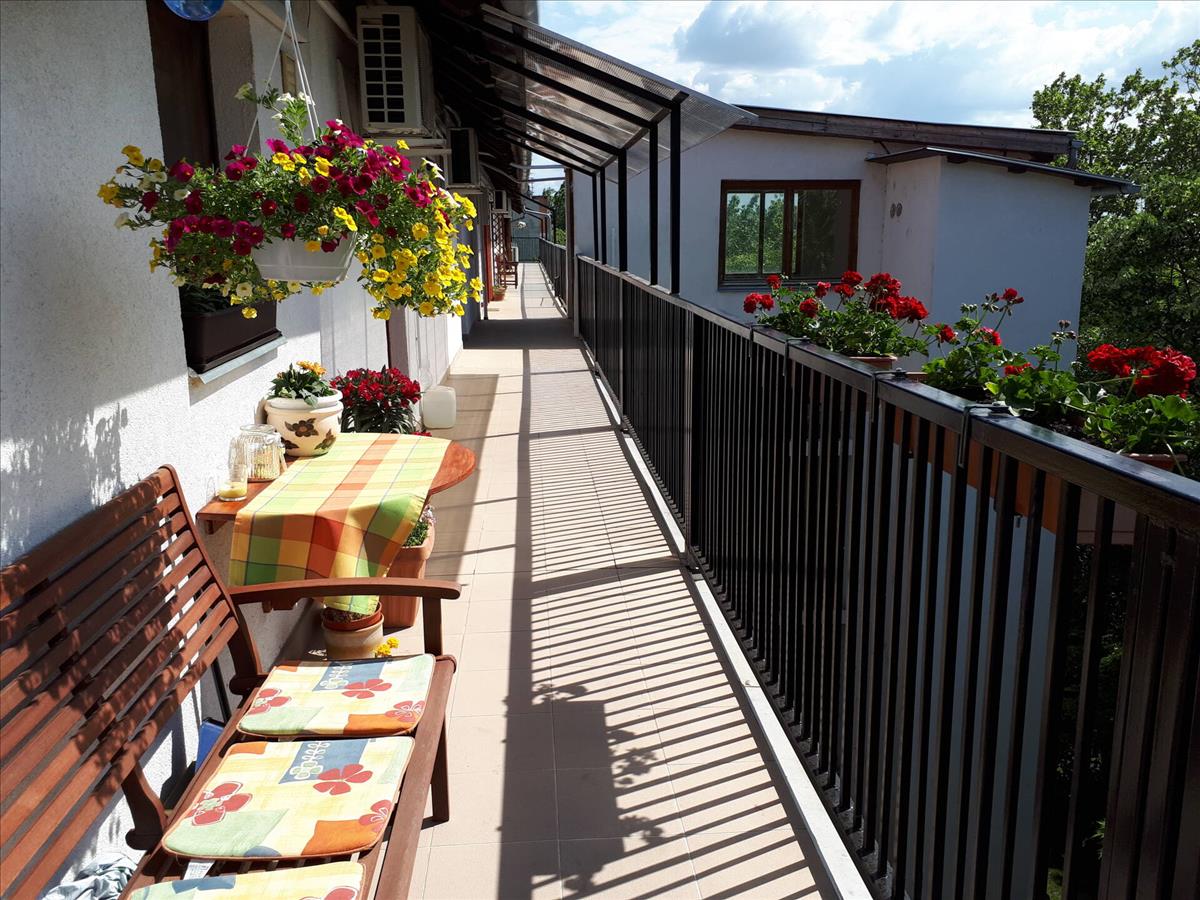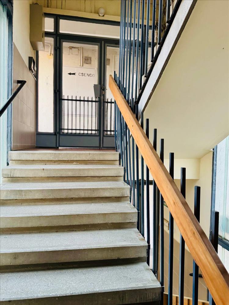 A lakásba egy függő lépcsőházból léphetünk be, amely egy hangulatos, virágos környezetből vezet az új otthonunkba. a társasházban lift is található.