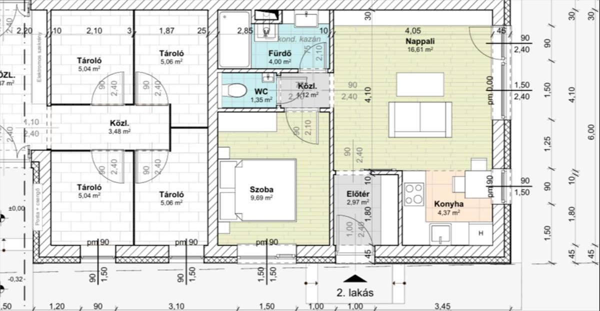 A lakás nettó 40 m2. a lakótérben előszoba, egy nappali+ konyha + étkező, 1 hálószoba, 1 fürdőszoba és 1 wc található.