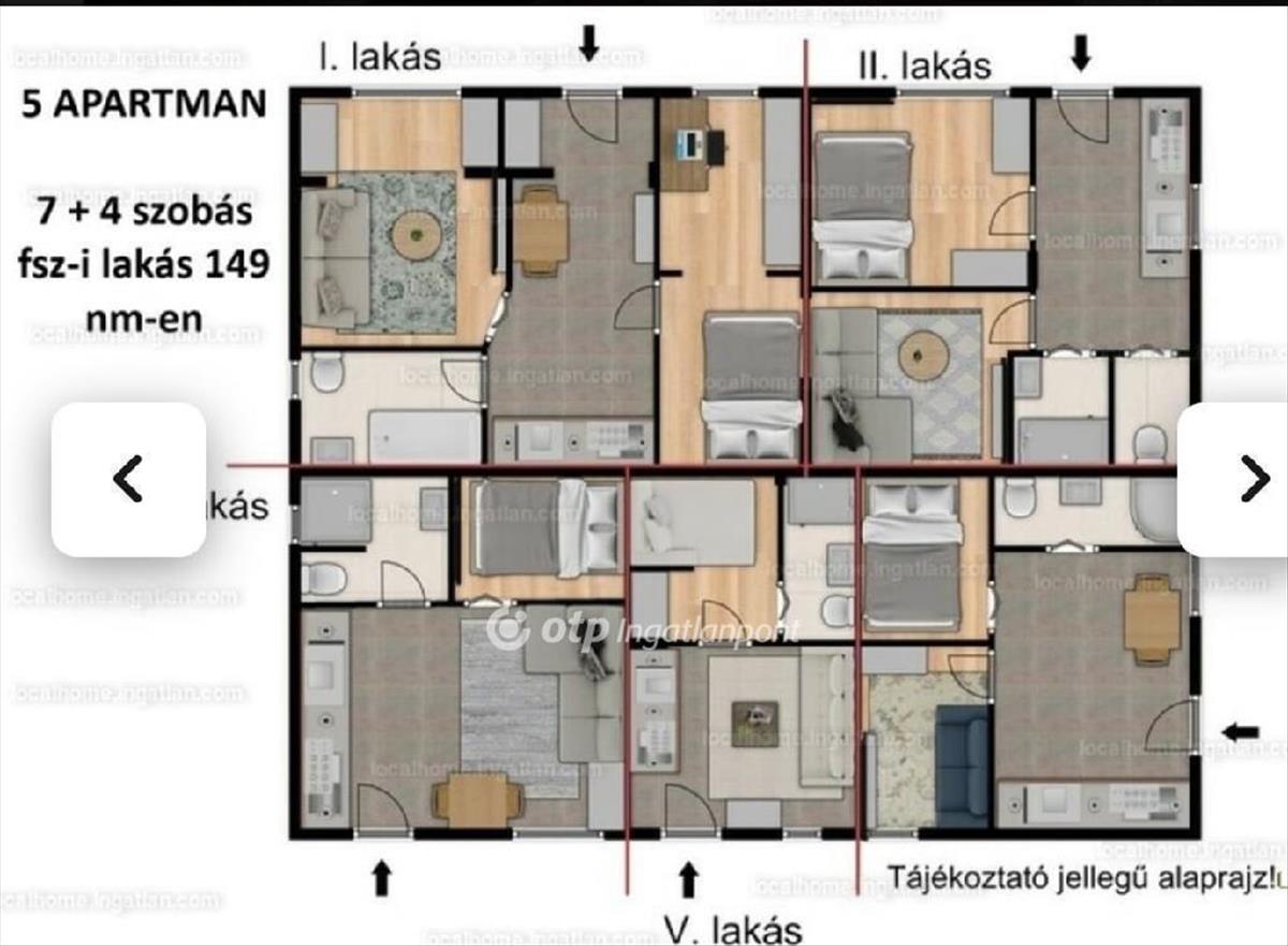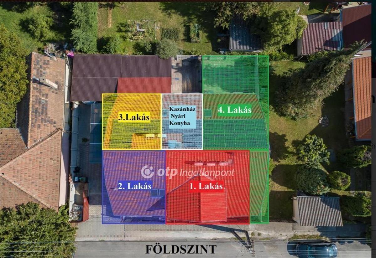 A földszinten egy 20 m2-es kazánház (wc-vel, zuhannyal, kis konyhával), illetve 4 db kisebb, 1-2-3 hálószobás lakrész található. Mindegyik külön bejáratos, zuhanyzós fürdőszobával, wc-vel, konyhával, amerikai konyhás nappalival, valamint inverteres hűtő-fűtő klímával rendelkezik. a fürdők és konyhák teljes gépesítést kaptak. Valamennyi lakrész saját, térkövezett udvart kapott. Az ingatlan komplex biztonsági rendszerrel (riasztó, kamerarendszer, kivonuló szolgálat) felszerelt.