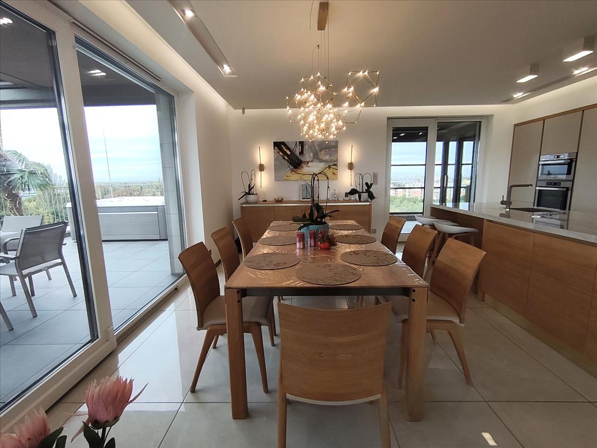 A modern építésű társasház legfelső szintjén található otthon 170 m²-es belső tere és 140 m²-es körpanorámás terasza tökéletes harmóniában kapcsolódik egymáshoz. Az örökpanorámás teraszról a város minden napszakban más arcát mutatja — a reggeli napfény aranylóan árasztja el a teret, estére pedig a városi fények varázsa tölti meg a horizontot.