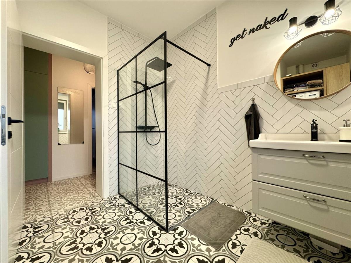 A különálló wc kézmosóval praktikus megoldás a családi mindennapokban, míg a tágas, nagy ablakos fürdőszoba modern kialakítású, esőztető zuhanyzóval, amely egy hosszú nap végén igazi feltöltődést kínál.