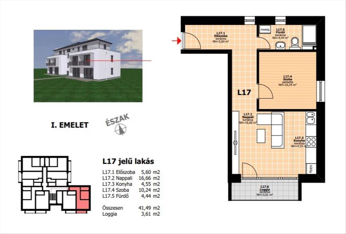 A lakásban 42m²-en amerikai konyhás nappali, 1 hálószoba, előszoba és 1 wc-vel felszerelt fürdőszoba kapott helyet. a nappalihoz tartozik még egy 3, 6m²-es erkély. a társasház mögött kialakításra kerül 22 felszíni parkoló, a pincében pedig 24 különböző méretű tároló. Az ingatlanhoz aszfaltos út vezet.