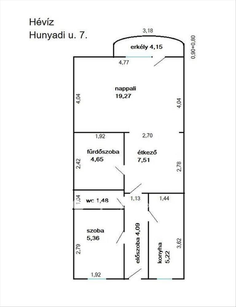 nappali + félszoba, konyha, külön fürdőszoba wc -vel, valamint egy külön mellékhelyiség, ami a mindennapi komfort szempontjából kifejezetten előnyös és ritka a piacon.
