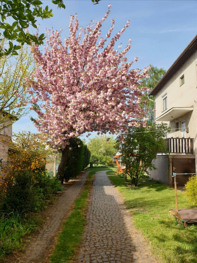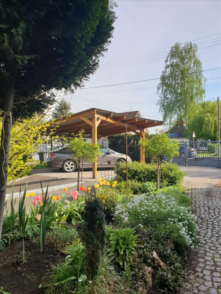 A ház körüli tér igazi pluszt ad: parkosított udvar, dísznövényekkel beültetett kert és egy kétállásos fedett autóbeálló teszi teljessé az otthon élményét.