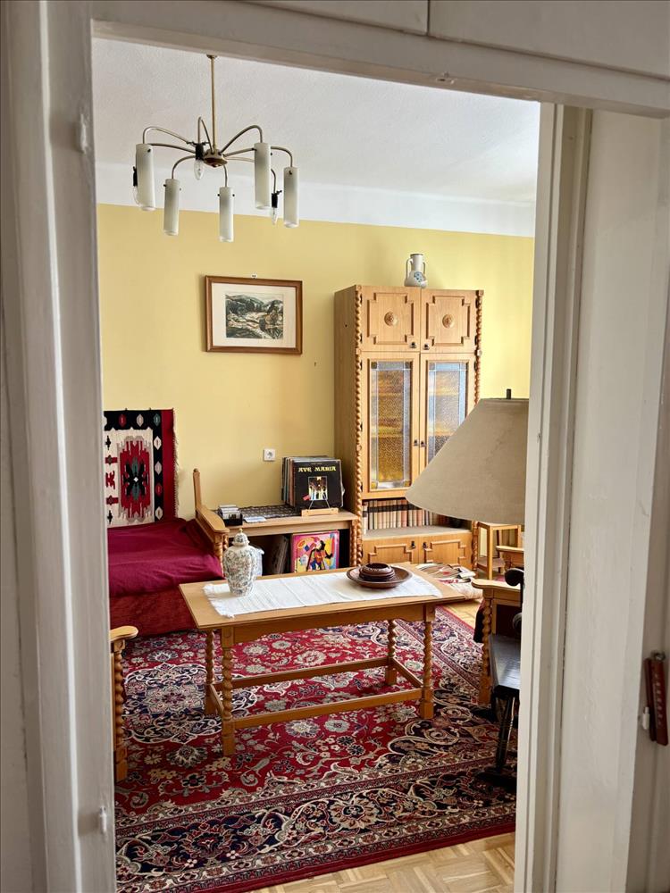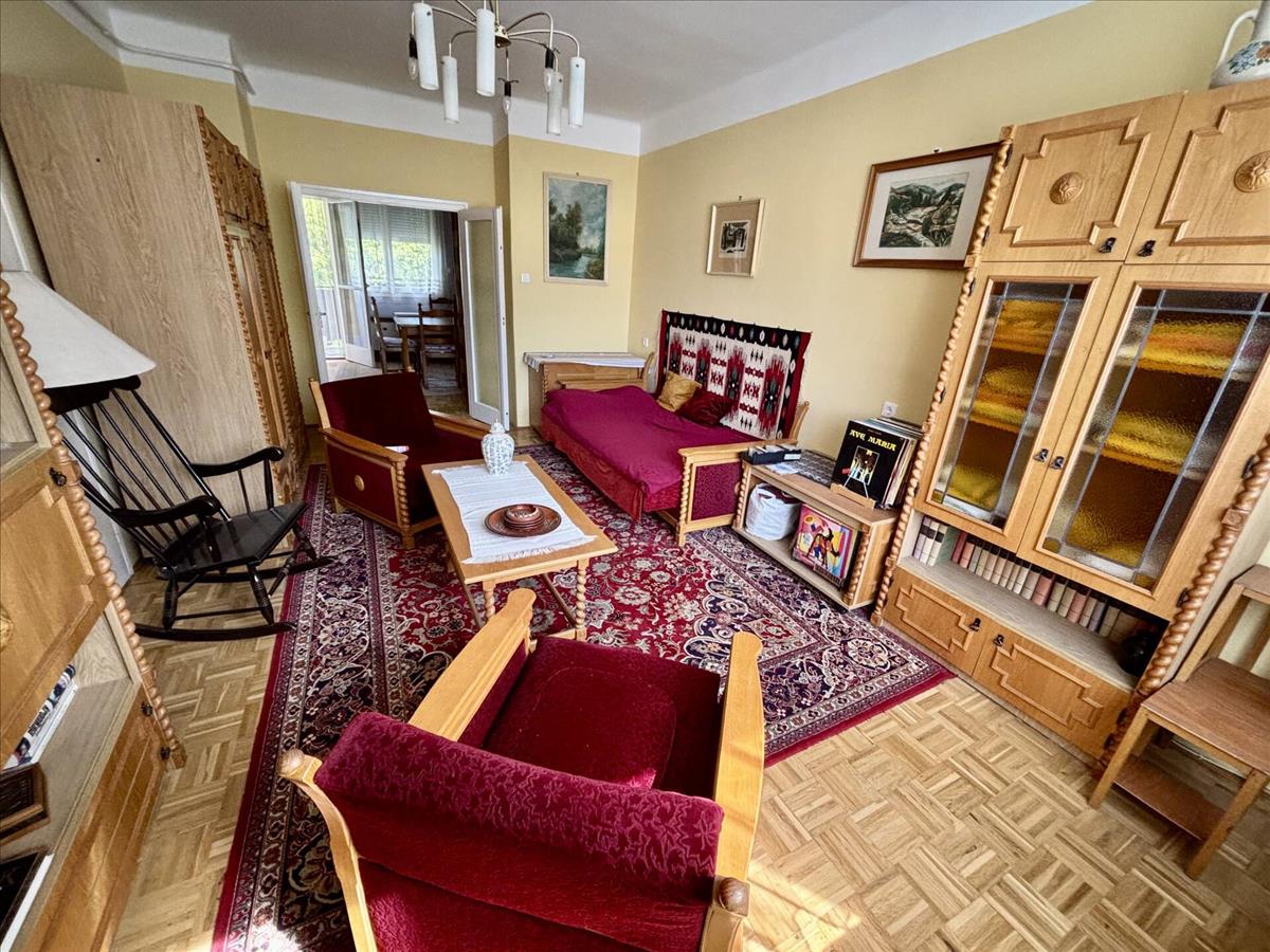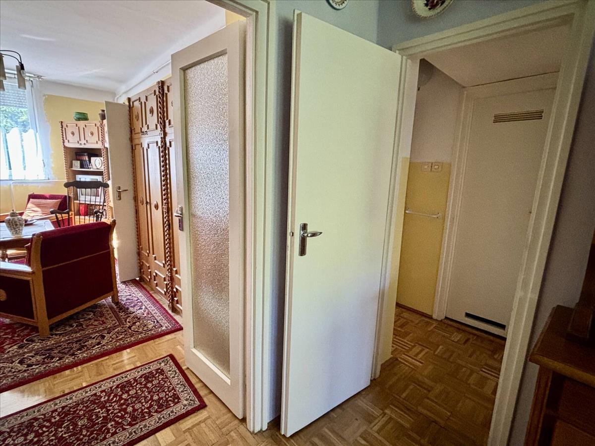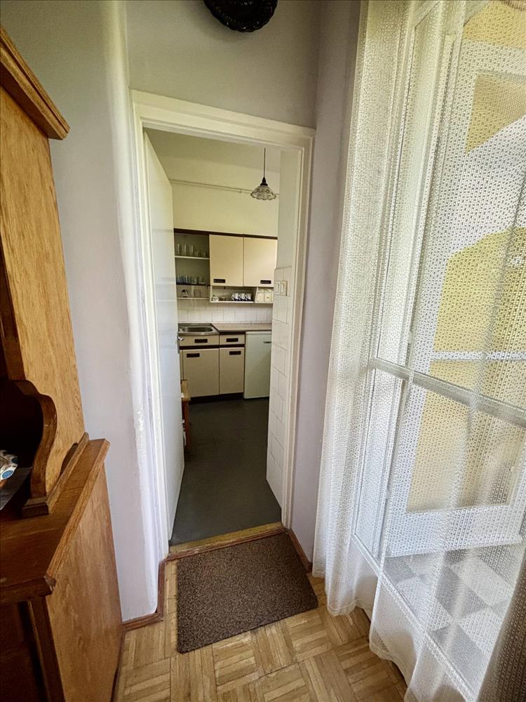 A lakás központi része egy étkező-hallos kialakítású tágas tér, melyből nyílik a 7 m²-es erkély, kellemes, parkra néző kilátással. Az ingatlanban eredeti fa parketta található, amely jó állapotú, minimális felújítással megőrizhető érték.