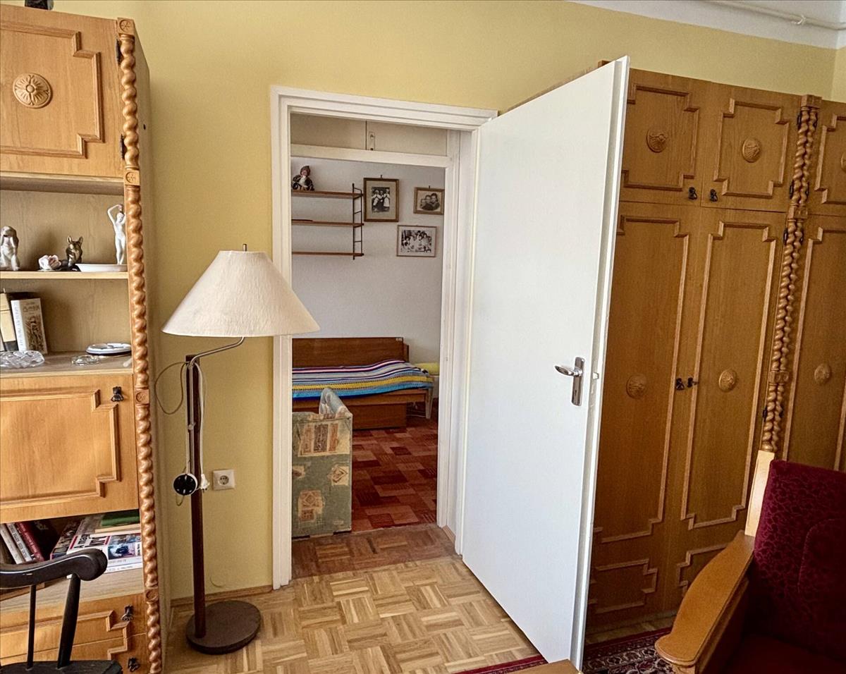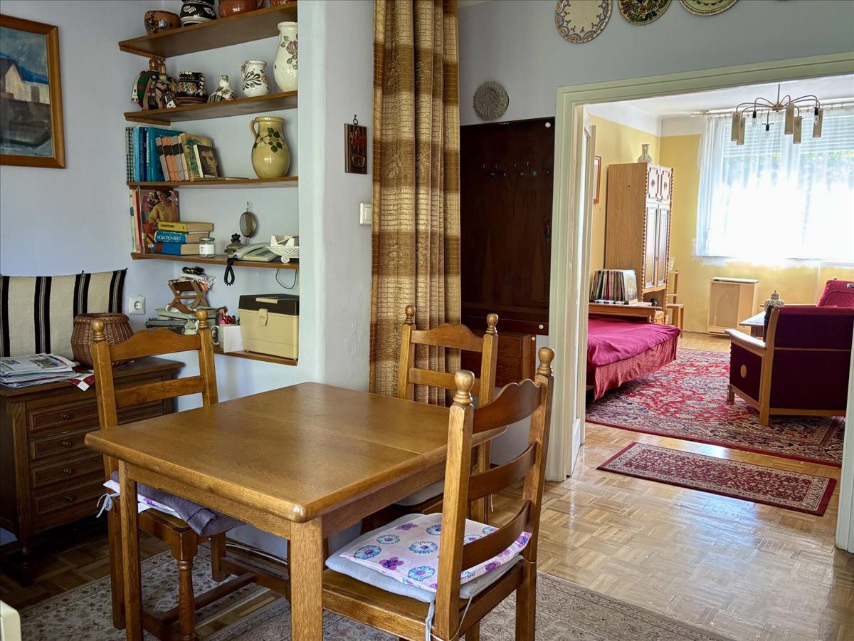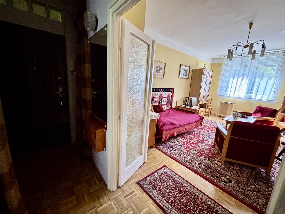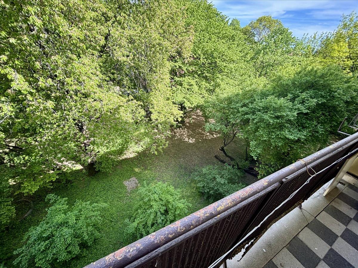 A lakás központi része egy étkező-hallos kialakítású tágas tér, melyből nyílik a 7 m²-es erkély, kellemes, parkra néző kilátással. Az ingatlanban eredeti fa parketta található, amely jó állapotú, minimális felújítással megőrizhető érték.
