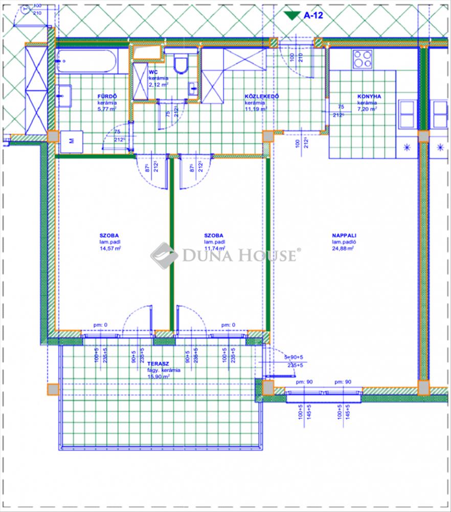 A lakás első emeleti 77 m²-es: amerikai konyhás nappali + 2 hálószoba. 16M²-es erkély tartozik a lakáshoz.