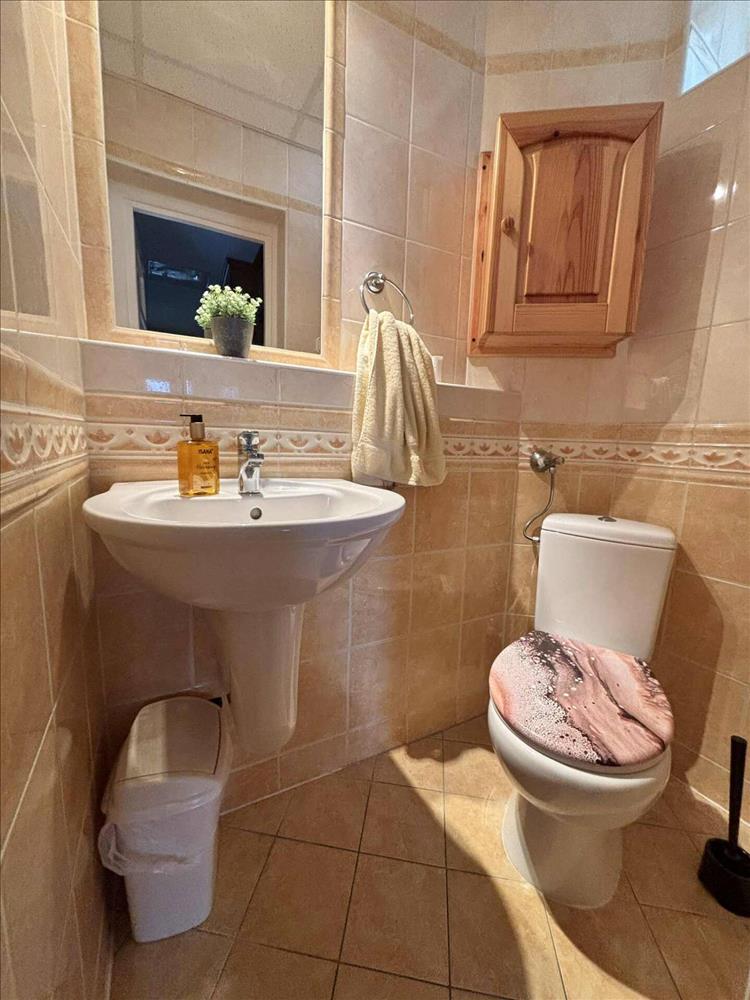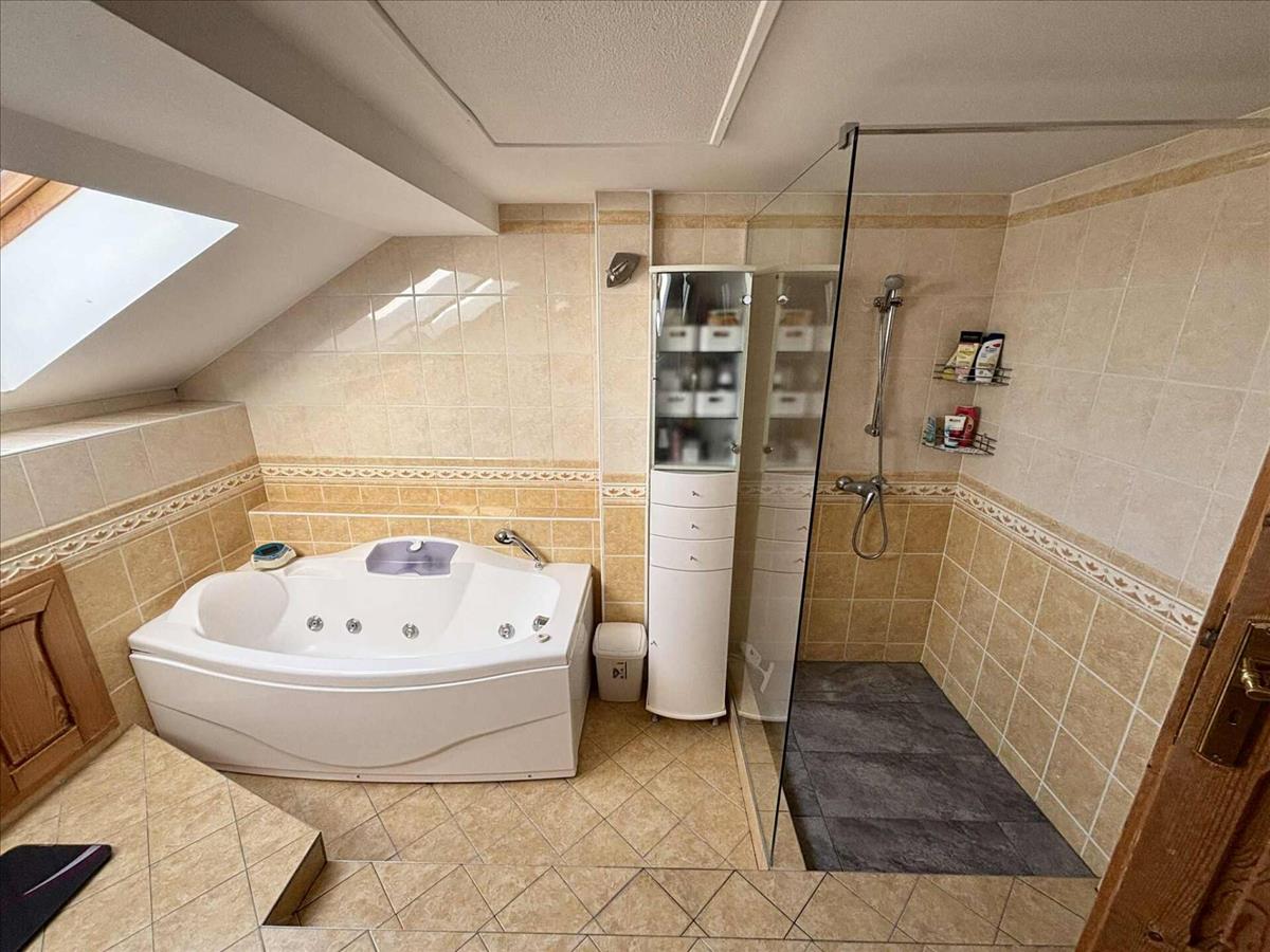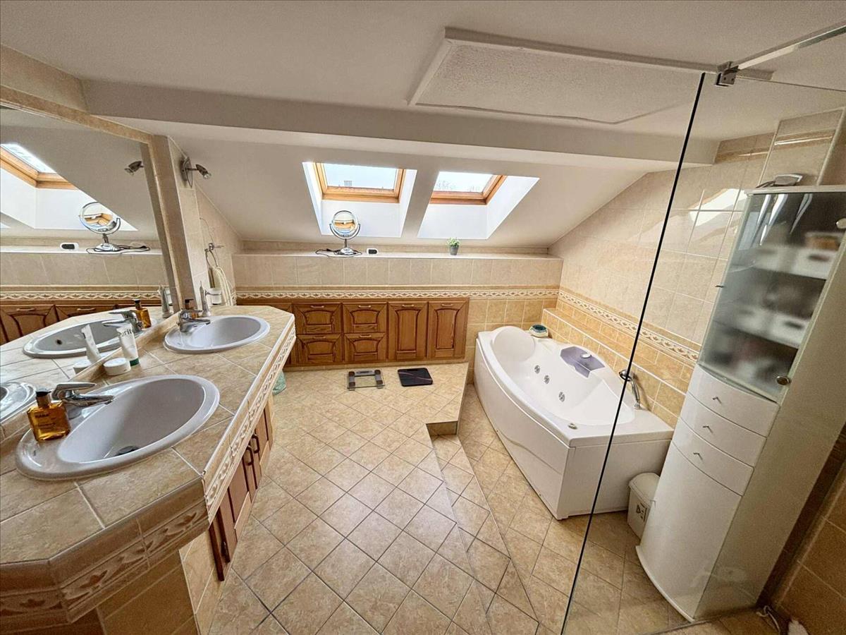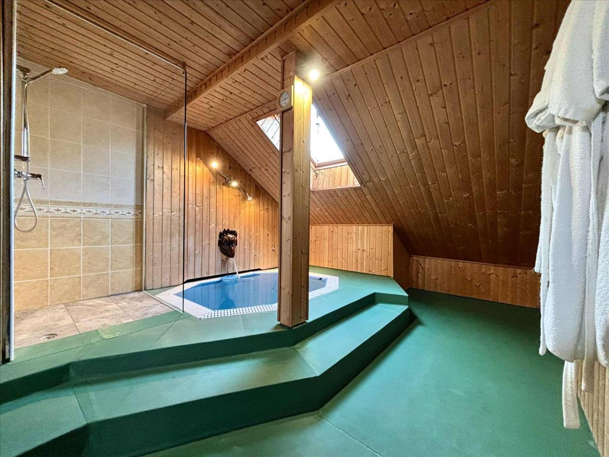 Emelet: 3 hálószoba, nagyméretű fürdőkáddal és tusolóval, külön wc, és egy wellness részleg, ahol egy finn szauna és egy merülő medence található, tusolóval, WC-vel ellátva.