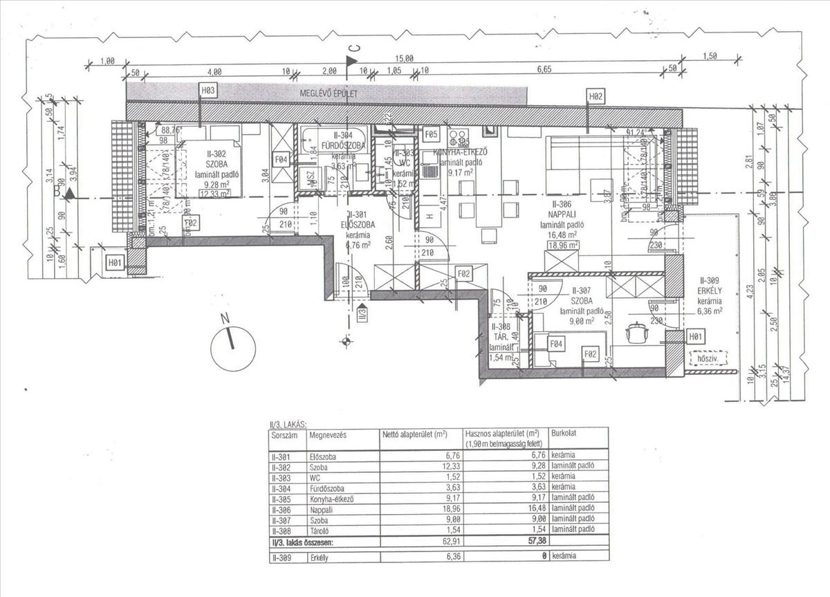 2. emeleti 62, 91 nm-es 2 szoba+ amerikai konyhás nappalis, 6, 36-nm-es erkéllyel, tárolóval.