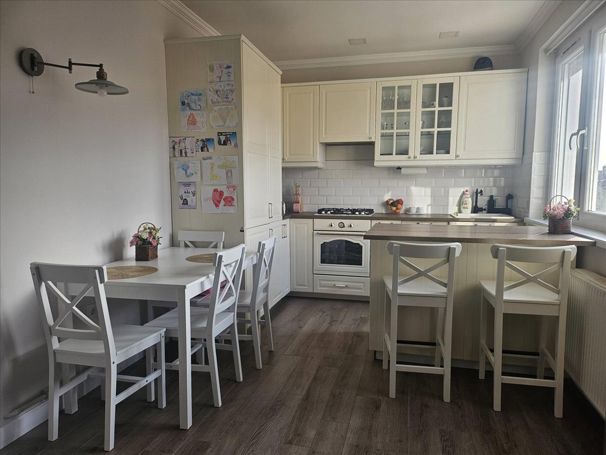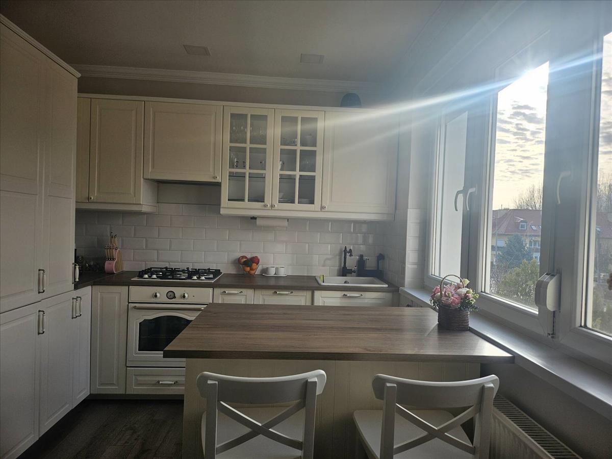 Tágas, napfényes amerikai konyhás nappali, magas minőségű, gépesített konyhabútorral, amely azonnal használható, további ráfordítás nélkül.