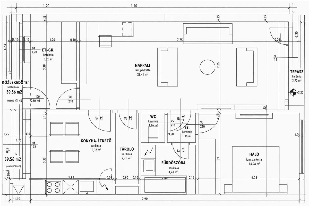 Az ingatlan alapterülete 70 m2 (+ 4 m2 terasz), így elegendő teret biztosít a kényelmes mindennapokhoz.
