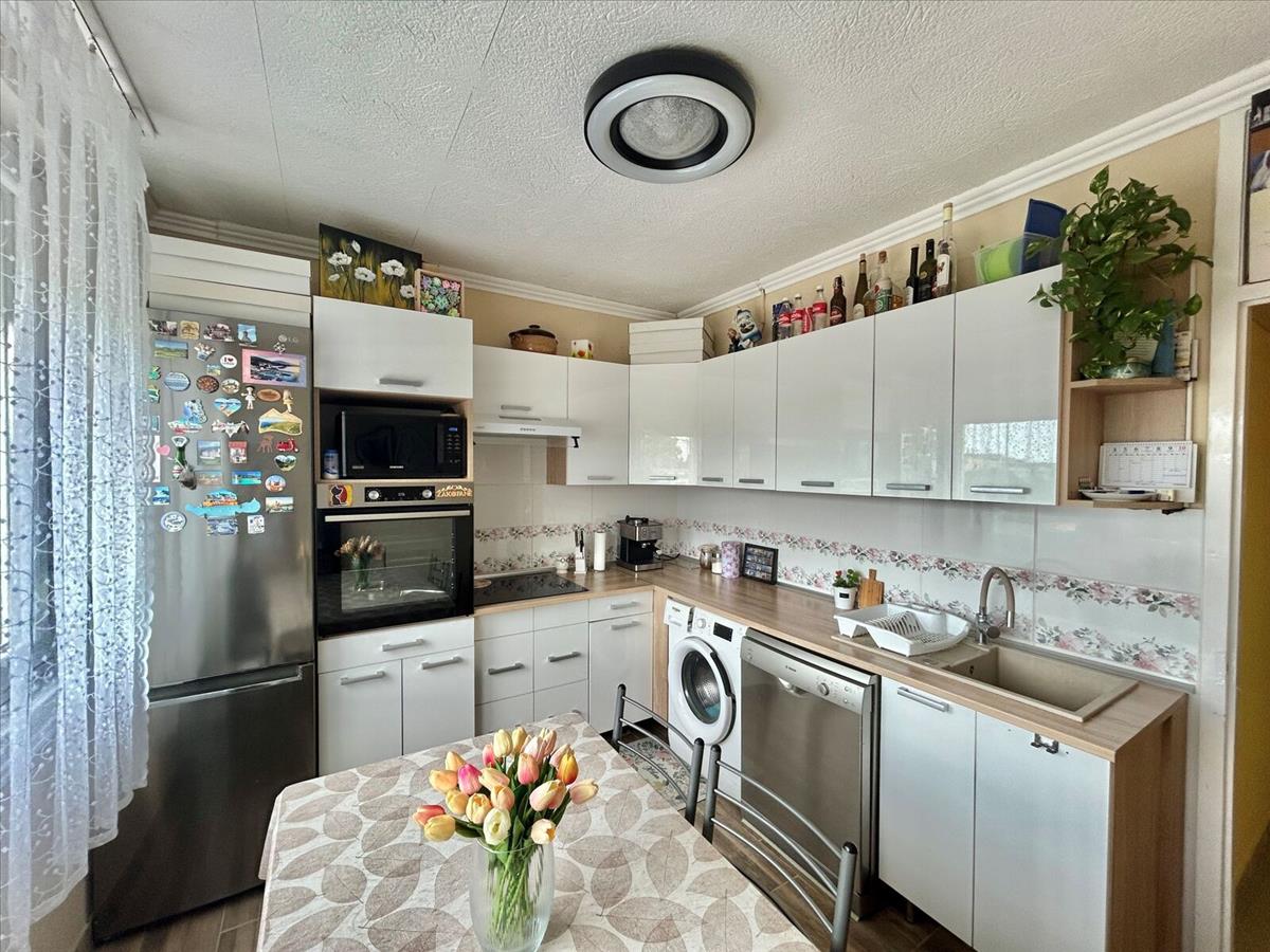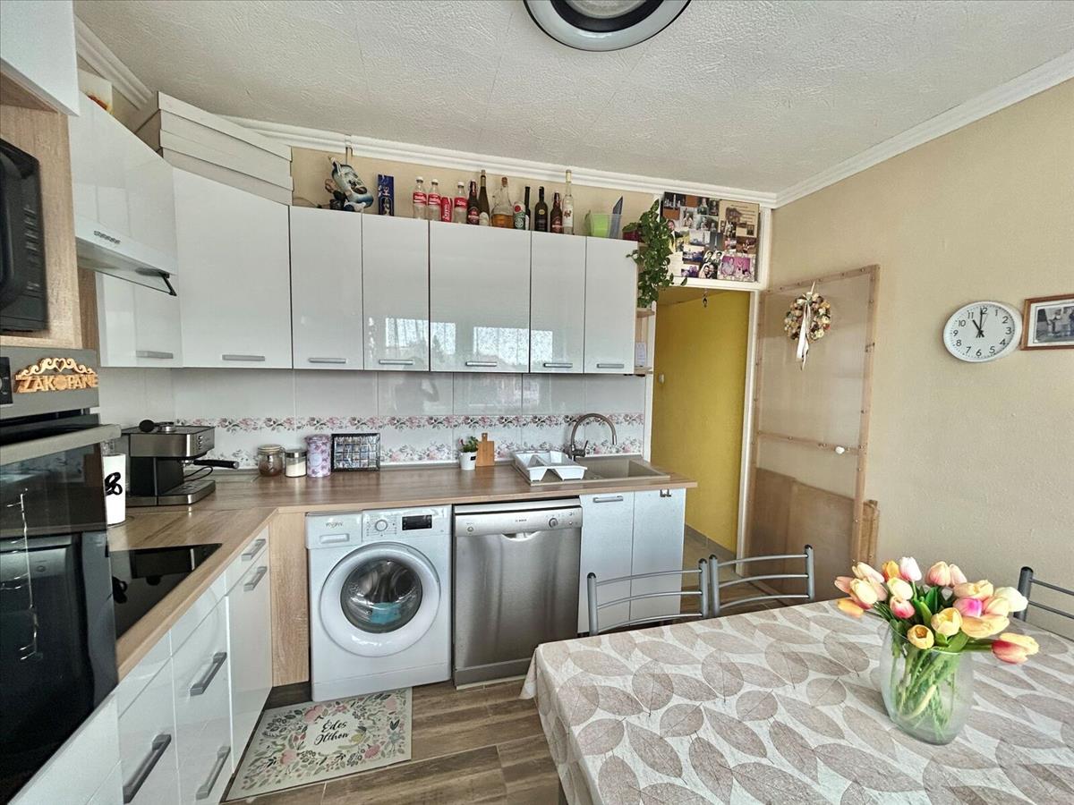 A konyhában beépített, gépesített konyhabútor található. a fürdőszoba felújított, a wc külön helyiségben kapott helyet. a burkolatok a szobákban laminált padló, a többi helyiségben járólap.