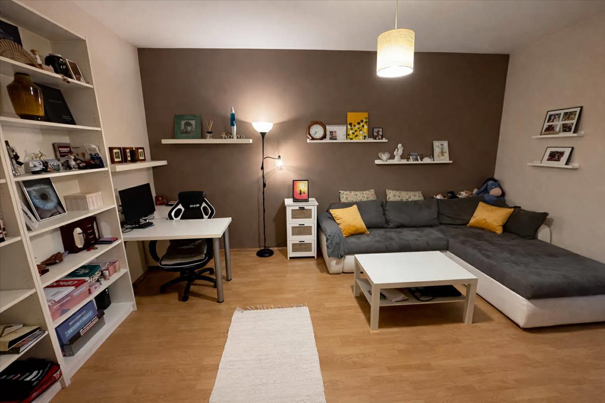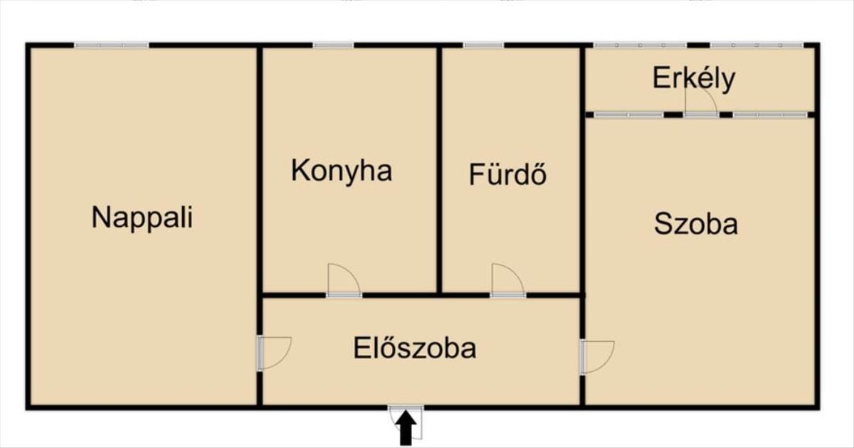 Elrendezése: nappali, háló + erkély, előszoba, konyha, fürdő+WC.