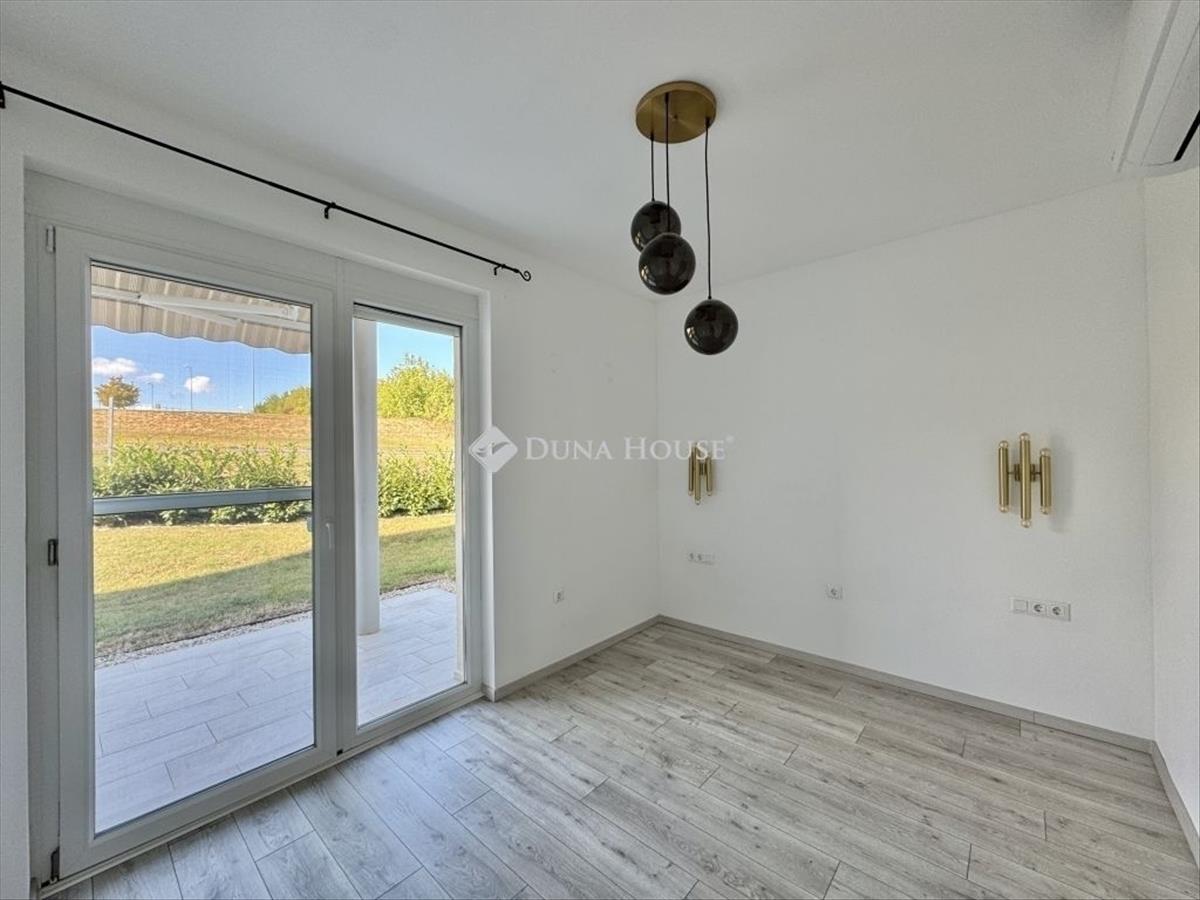 Eladó újszerű kertvárosi lakás, saját parkosított kertkapcsolattal! ! ! ! ! Pécs egyik csendes, zöldövezeti részén kínálunk megvételre egy 2023-ban átadott 92 m²-es földszinti lakást, amely minden igényt kielégítő belső kialakítással és kivételes külső adottságokkal rendelkezik. Kertkapcsolat és extra területekA lakáshoz tartozik egy 240 m²-es kizárólagos használatú, parkosított kert, benne egy könnyűszerkezetes, 10 m²-es kisházzal ideális tárolónak vagy hobbihelyiségnek. Két kényelmes terasz, mindkettő beépített, kinyitható árnyékolóval. a kertből kiskapun keresztül is eljuthatunk a két autóbeállóhoz, melyek közvetlenül a lakás előtt helyezkednek el. Belső elrendezés 3 hálószoba Tágas nappali-konyha-étkező egy légtérben 2 igényes fürdőszobaPrémium felszereltség fap olasz hidegburkolatok Hansgrohe falba süllyesztett csaptelepek Blanco gránit mosogató és csaptelep a konyhában Minőségi német konyhabútor kompakt munkapulttal, konyhaszigettel Új, elektromos fehér alumínium redőnyök minden ablakon Hőszivattyús padlófűtés + fancoil hűtés a kellemes klímáért egész évben Alacsony rezsiköltségek, energiahatékony, és letisztult, igényes belső terek. Elhelyezkedés szempontjából is ideális:A belváros autóval mindössze 7 perc, de a tömegközlekedés is kiváló. a mindennapi ügyintézéshez szükséges szolgáltatások csupán egy percre találhatók: Tesco, Rossmann, gyógyszertár, minden gyalogosan is gyorsan elérhető. FIX 3% lakáshitelre megvehető