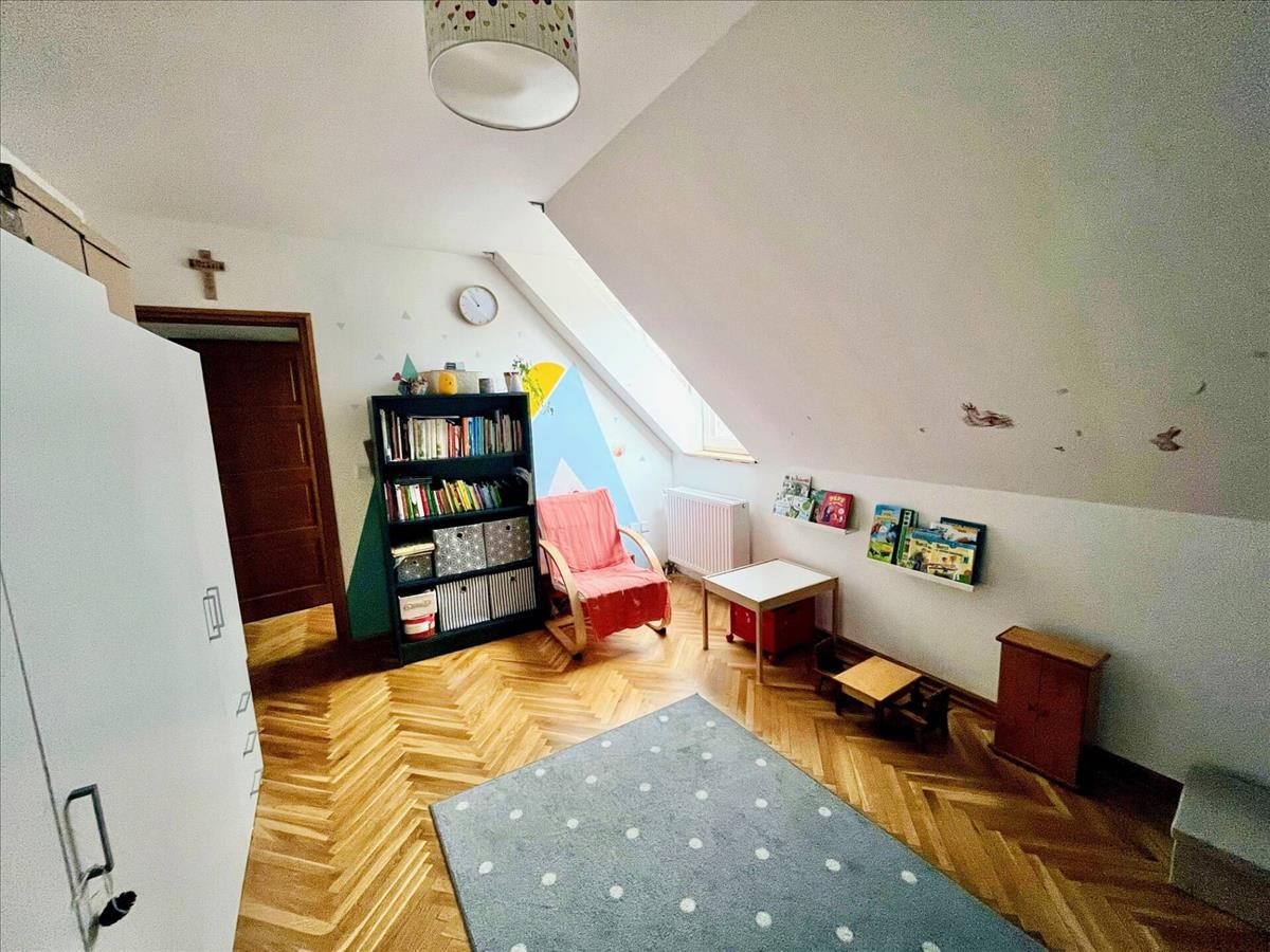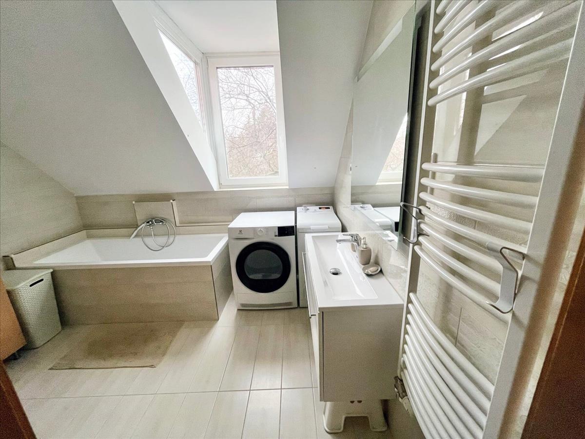 Az emeleten két hálószoba valódi fa parkettával, modern fürdőszoba szauna előkészítéssel, dupla mosdóval és fűtött tükörrel, valamint kazánház/tároló kapott helyet.