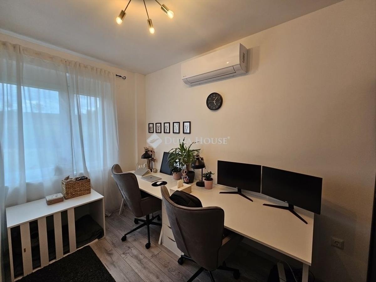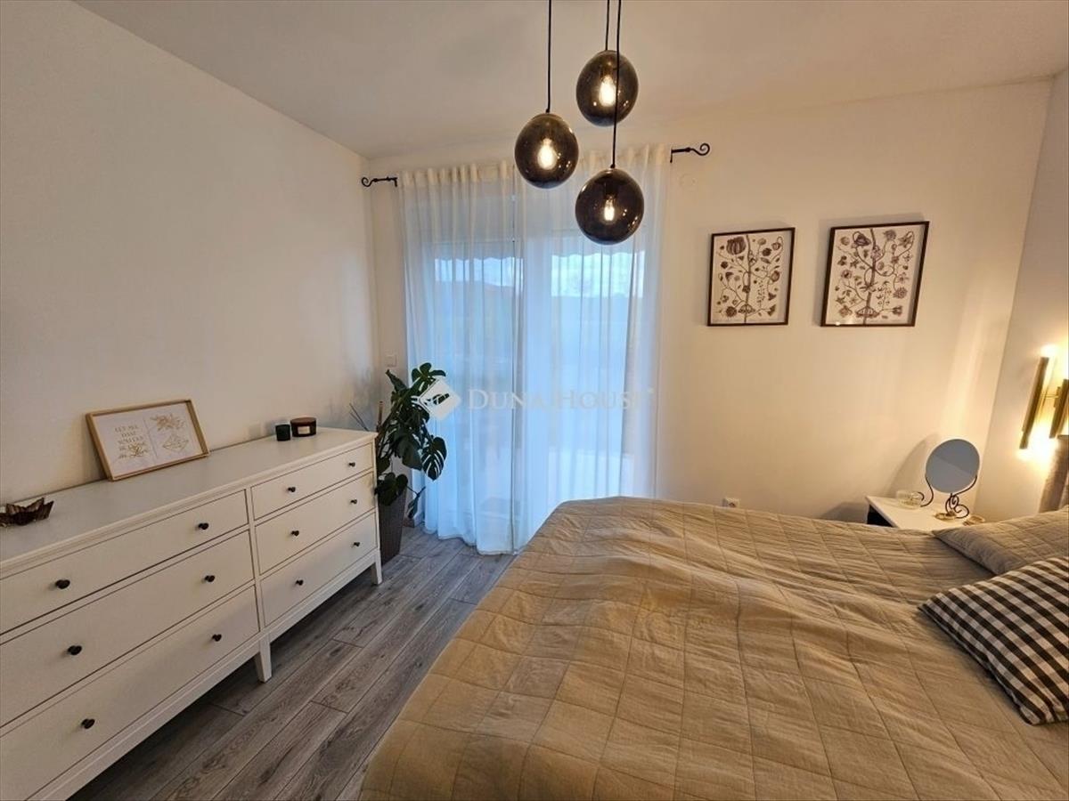 Kertkapcsolat és extra területek. a lakáshoz tartozik egy 240 m²-es kizárólagos használatú, parkosított kert, benne egy könnyűszerkezetes, 10 m²-es kisházzal ideális tárolónak vagy hobbihelyiségnek. Két kényelmes terasz, mindkettő beépített, kinyitható árnyékolóval. a kertből kiskapun keresztül is eljuthatunk a két autóbeállóhoz, melyek közvetlenül a lakás előtt helyezkednek el. Belső elrendezés 3 hálószoba Tágas nappali-konyha-étkező egy légtérben 2 igényes fürdőszobaPrémium felszereltség fap olasz hidegburkolatok Hansgrohe falba süllyesztett csaptelepek Blanco gránit mosogató és csaptelep a konyhában Minőségi német konyhabútor kompakt munkapulttal, konyhaszigettel Új, elektromos fehér alumínium redőnyök minden ablakon Hőszivattyús padlófűtés + fancoil hűtés a kellemes klímáért egész évben Alacsony rezsiköltségek, energiahatékony, és letisztult, igényes belső terek.