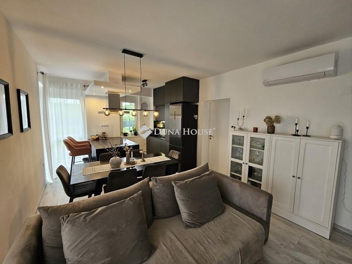 Eladó újszerű kertvárosi lakás, saját parkosított kertkapcsolattal! ! ! ! ! Pécs egyik csendes, zöldövezeti részén kínálunk megvételre egy 2023-ban átadott 92 m²-es földszinti lakást, amely minden igényt kielégítő belső kialakítással és kivételes külső adottságokkal rendelkezik. Kertkapcsolat és extra területekA lakáshoz tartozik egy 240 m²-es kizárólagos használatú, parkosított kert, benne egy könnyűszerkezetes, 10 m²-es kisházzal – ideális tárolónak vagy hobbihelyiségnek. Két kényelmes terasz, mindkettő beépített, kinyitható árnyékolóval. a kertből kiskapun keresztül is eljuthatunk a két autóbeállóhoz, melyek közvetlenül a lakás előtt helyezkednek el. Belső elrendezés 3 hálószoba Tágas nappali-konyha-étkező egy légtérben 2 igényes fürdőszobaPrémium felszereltség fap olasz hidegburkolatok Hansgrohe falba süllyesztett csaptelepek Blanco gránit mosogató és csaptelep a konyhában Minőségi német konyhabútor kompakt munkapulttal, konyhaszigettel Új, elektromos fehér alumínium redőnyök minden ablakon Hőszivattyús padlófűtés + fancoil hűtés a kellemes klímáért egész évben Alacsony rezsiköltségek, energiahatékony, és letisztult, igényes belső terek. Elhelyezkedés szempontjából is ideális:A belváros autóval mindössze 7 perc, de a tömegközlekedés is kiváló. a mindennapi ügyintézéshez szükséges szolgáltatások csupán egy percre találhatók: Tesco, Rossmann, gyógyszertár, minden gyalogosan is gyorsan elérhető. FIX 3% lakáshitelre megvehető