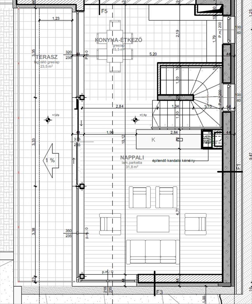Tágas nappali, 4 külön nyíló hálószoba, világos terek, letisztult, stílusos kialakítás jellemzi. a nappaliban kandalló gondoskodik a hangulatról.