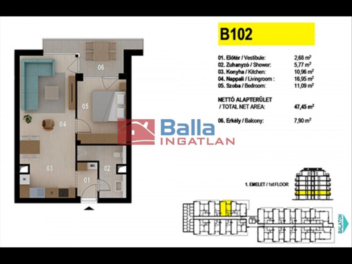 A Balla Ingatlan siófoki irodája öt emeletes apartmanházban(100 lakás) kínál panorámás, vízparti lakásokat megvételre. Praktikum, használhatóság, fenntarthatóság jellemzi a lifttel rendelkező ingatlant. Jó elhelyezkedés, igényes tervezés, értékállóság 6 szinten. 46-81 m2 közötti alapterületekkel, élhető erkélyekkel, földszinti kertkapcsolattal, beléptető rendszerrel, tetőterén exkluzív panorámás tetőteraszokkal kínáljuk őket.