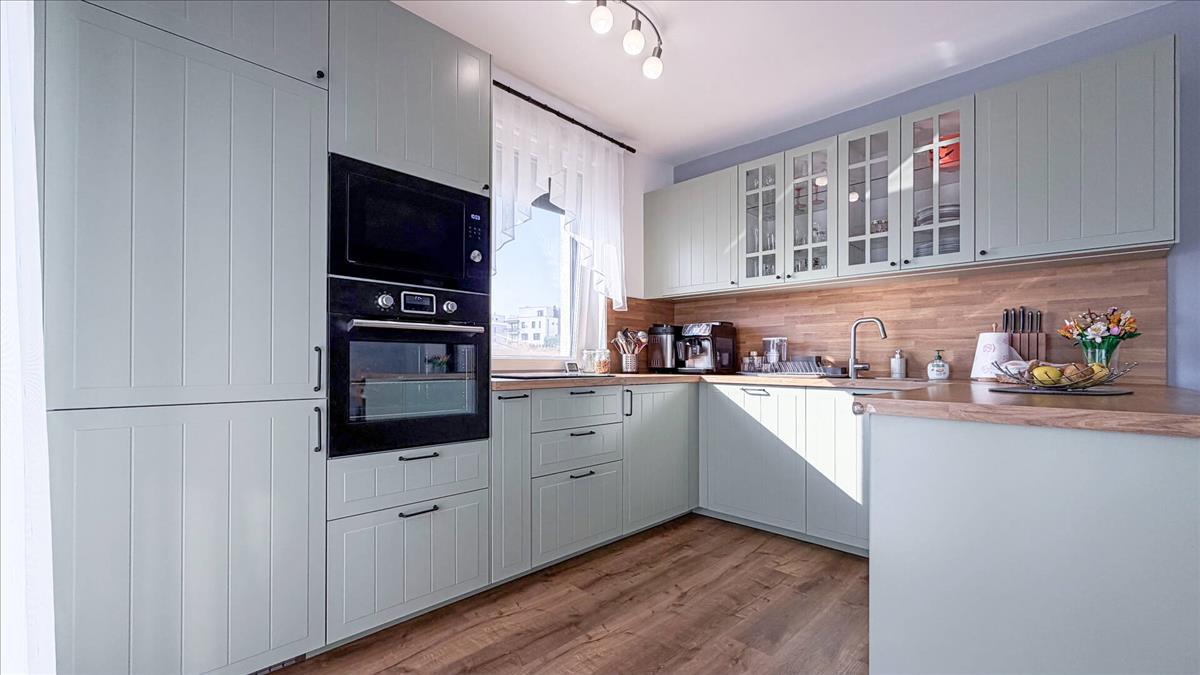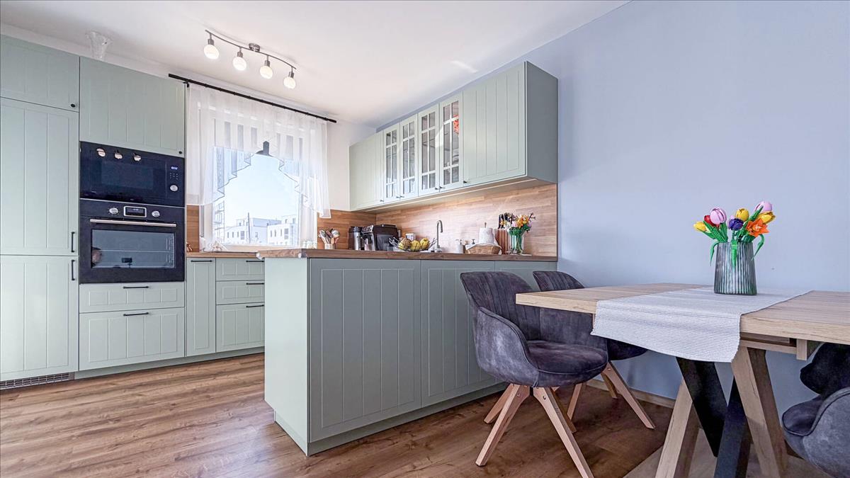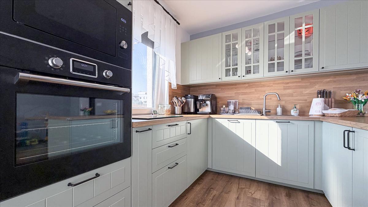 A lakás egyik karakteres, szinte vadonat új eleme a pasztellzöld ikea konyhabútor, amely teljes gépesítéssel került beépítésre:
