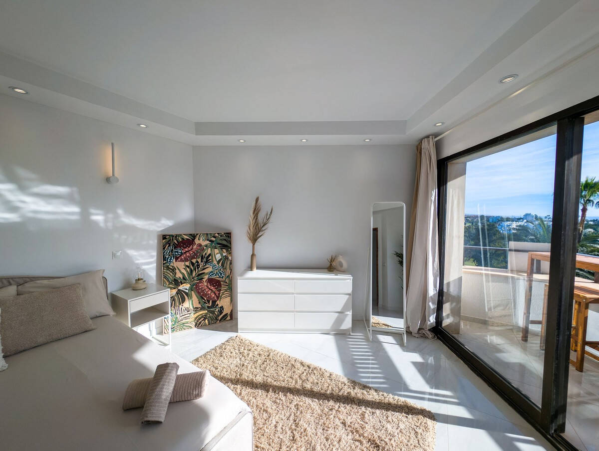 Ez a lenyűgöző, teljesen felújított 2 hálószobás, 3 fürdőszobás apartman kiváló állapotú és használatra kész. Ez az otthon a modern kényelem, a csúcsminőségű kivitelezés és a lélegzetelállító kilátás tökéletes keverékét kínálja. a lakás a lépcsőszintről közelíthető meg (kerekesszékbarát). a 100 nm-es lakásban tágas és kényelmesen berendezett nappali található, amely zökkenőmentesen kapcsolódik egy gyönyörű nyitott konyhához, luxus faburkolattal és egyedi világítással. Az átgondolt tervezésű, egyedi világítás az egész lakásban fel van szerelve, fokozva annak meleg és hívogató hangulatát. Mindkét tágas hálószobát elárasztja a természetes fény, így világos és nyugodt terek jönnek létre a lazításhoz. a lakáshoz két tágas, összesen 28 nm-es, déli/keleti fekvésű erkély is tartozik, amelyek egész nap bőséges napfényt biztosítanak. a privát teraszról élvezze a kivételes panorámás kilátást a golfpályára, a Földközi-tengerre és az ikonikus La Concha-hegyre.