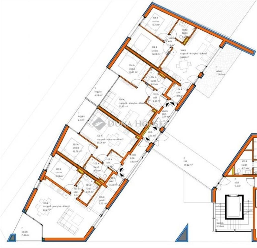 A 104. B számú lakás a hatszintes épület 1. emeletén található. Hasznos alapterülete 54, 2 m2, melyben amerikai konyha+ nappali, 1 egész + 1 féll szoba, fürdő, közlekedő és előtér került kialakításra. a környezettel való kapcsolatot a nappaliból elérhető 12, 89 m2-es erkély biztosítja.