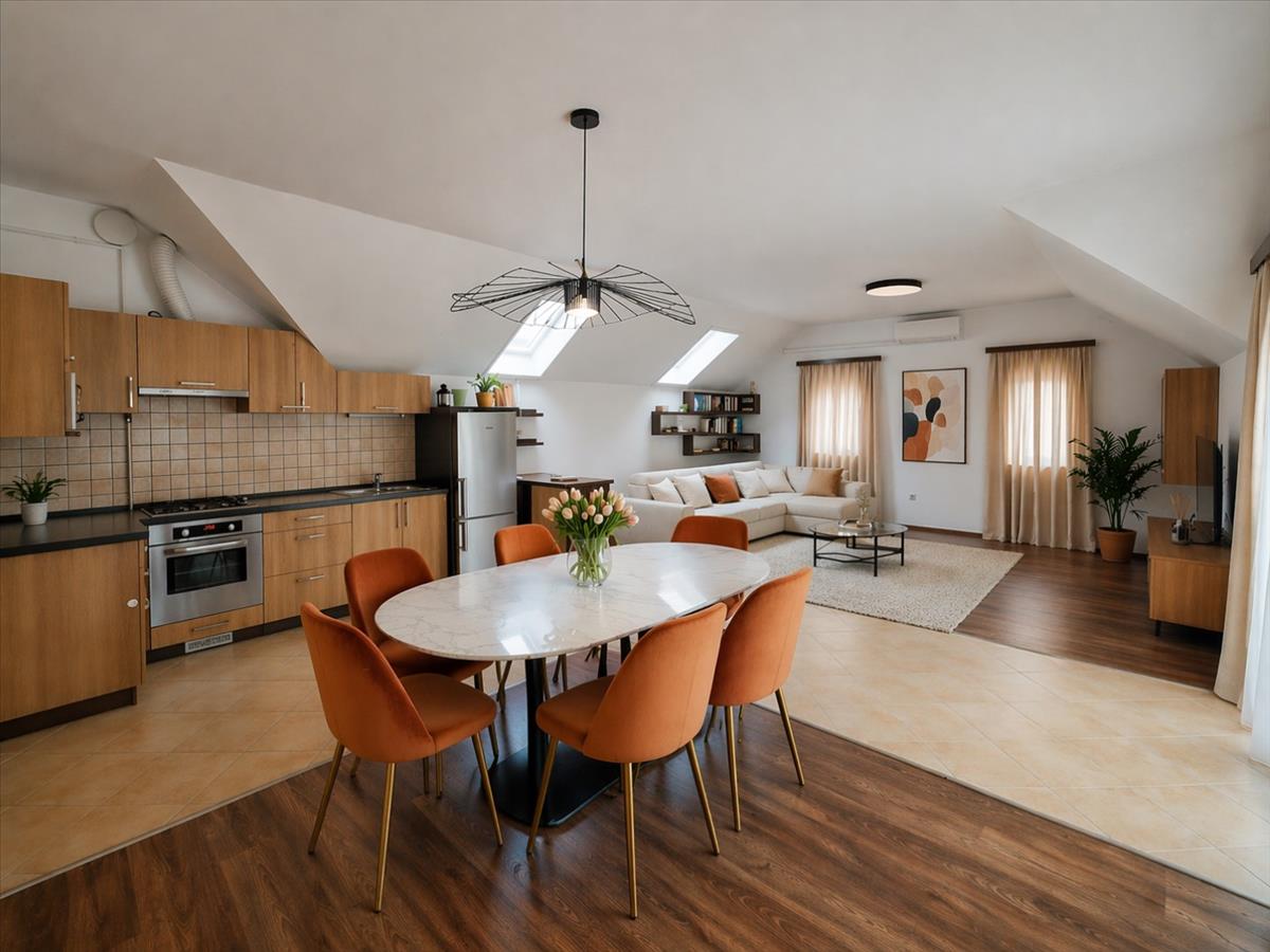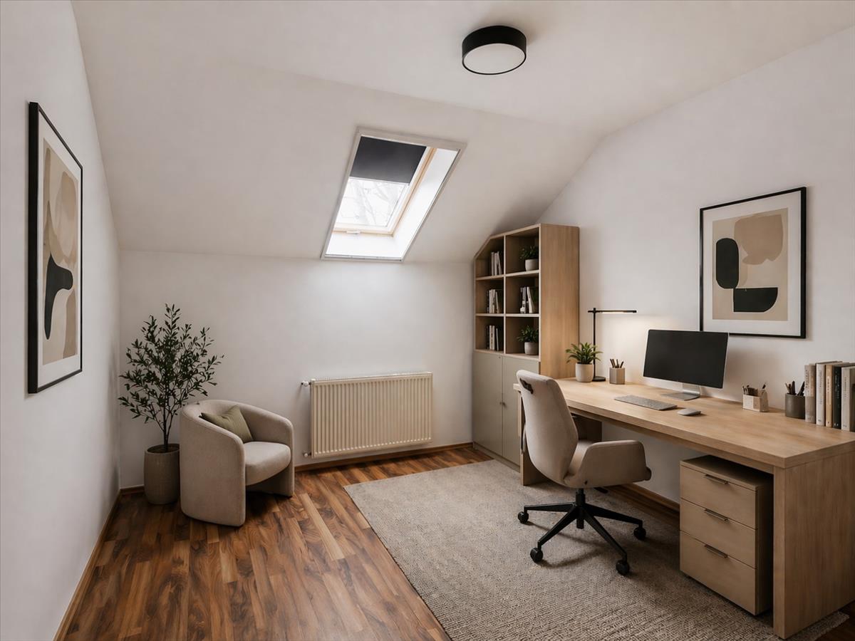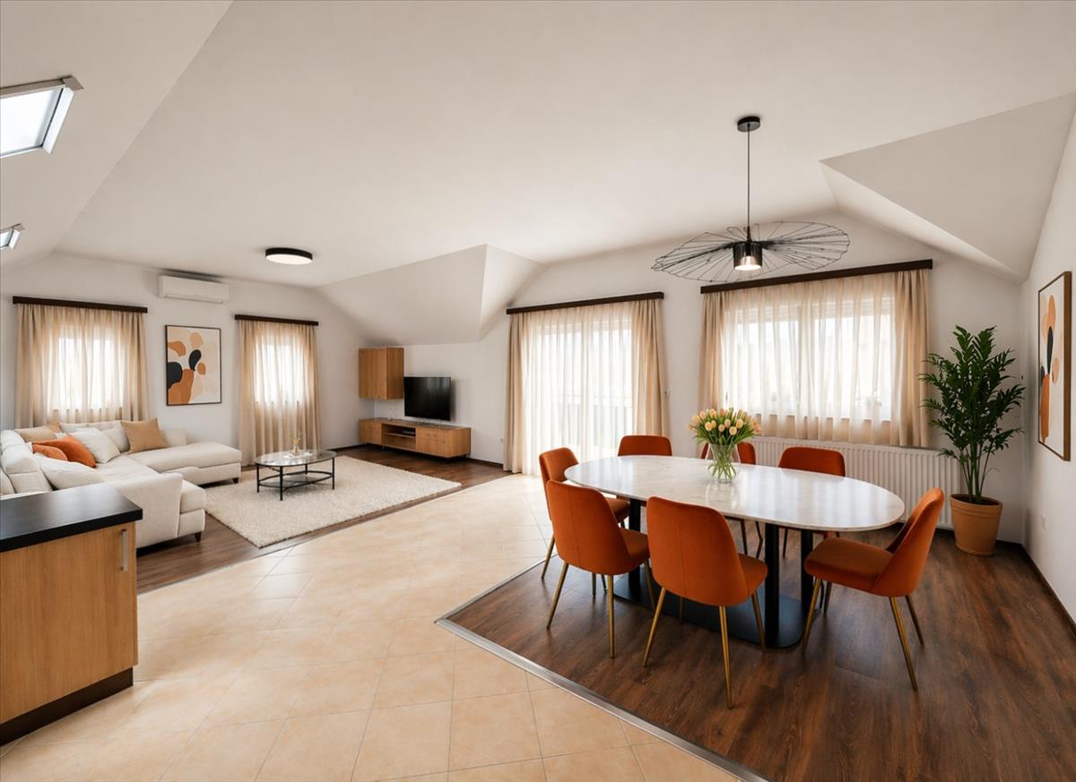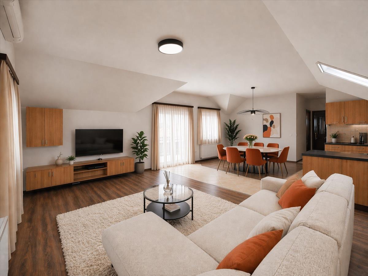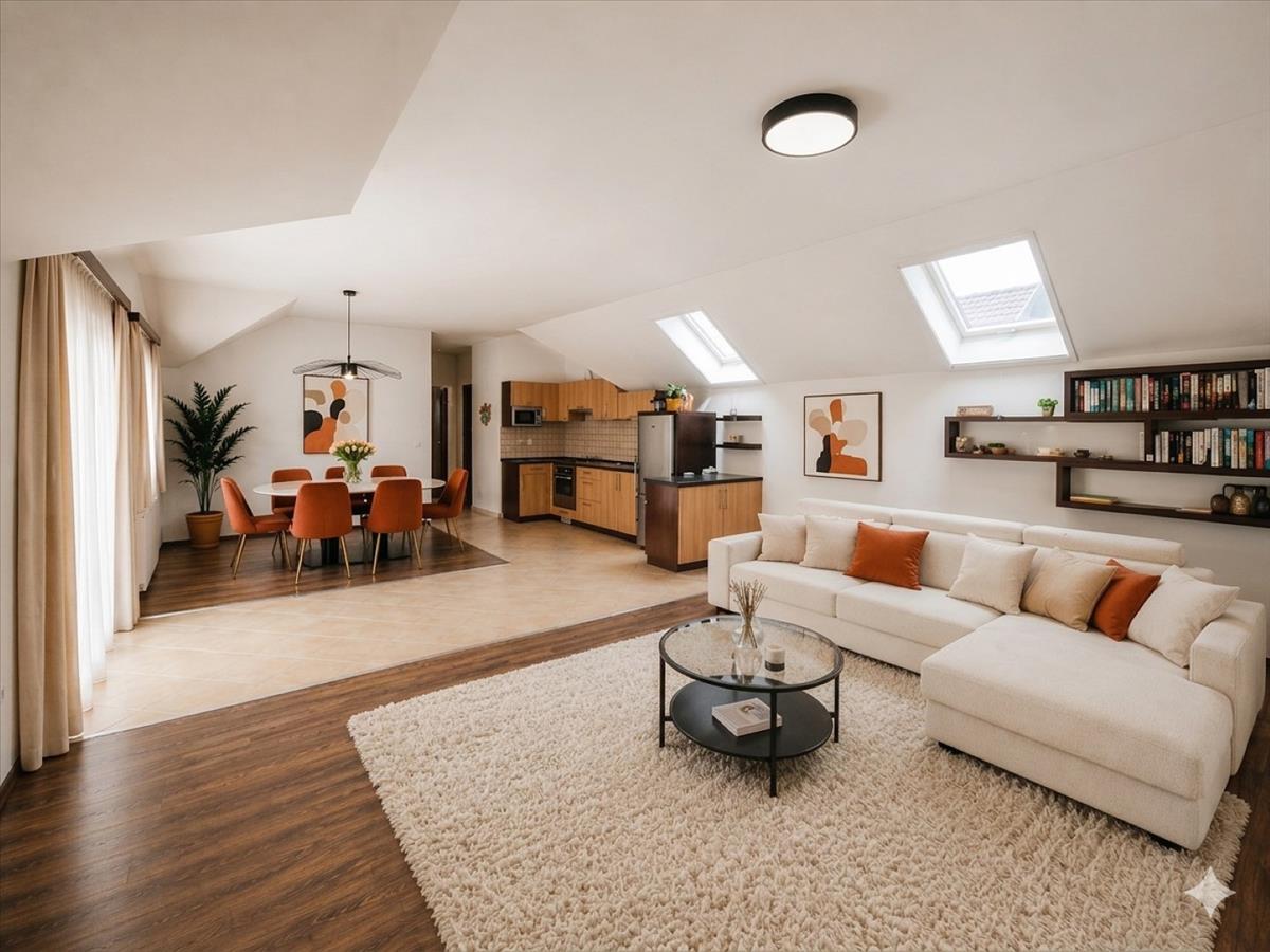 A tetőtéri hangulat külön karaktert ad a lakásnak, de a használhatóság sem vész el: a ferde falak csak 180 cm-nél kezdődnek, így nem kell minden bútornál kreatív túlélési stratégiát kidolgozni.