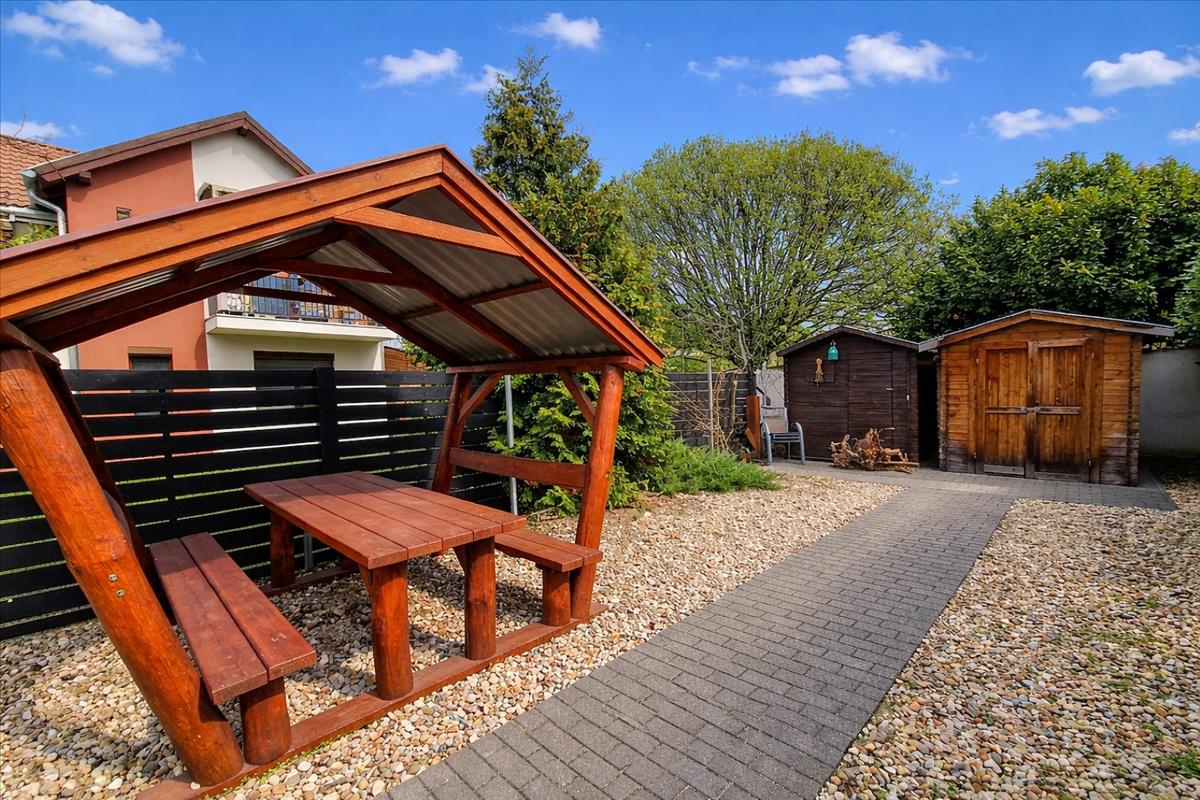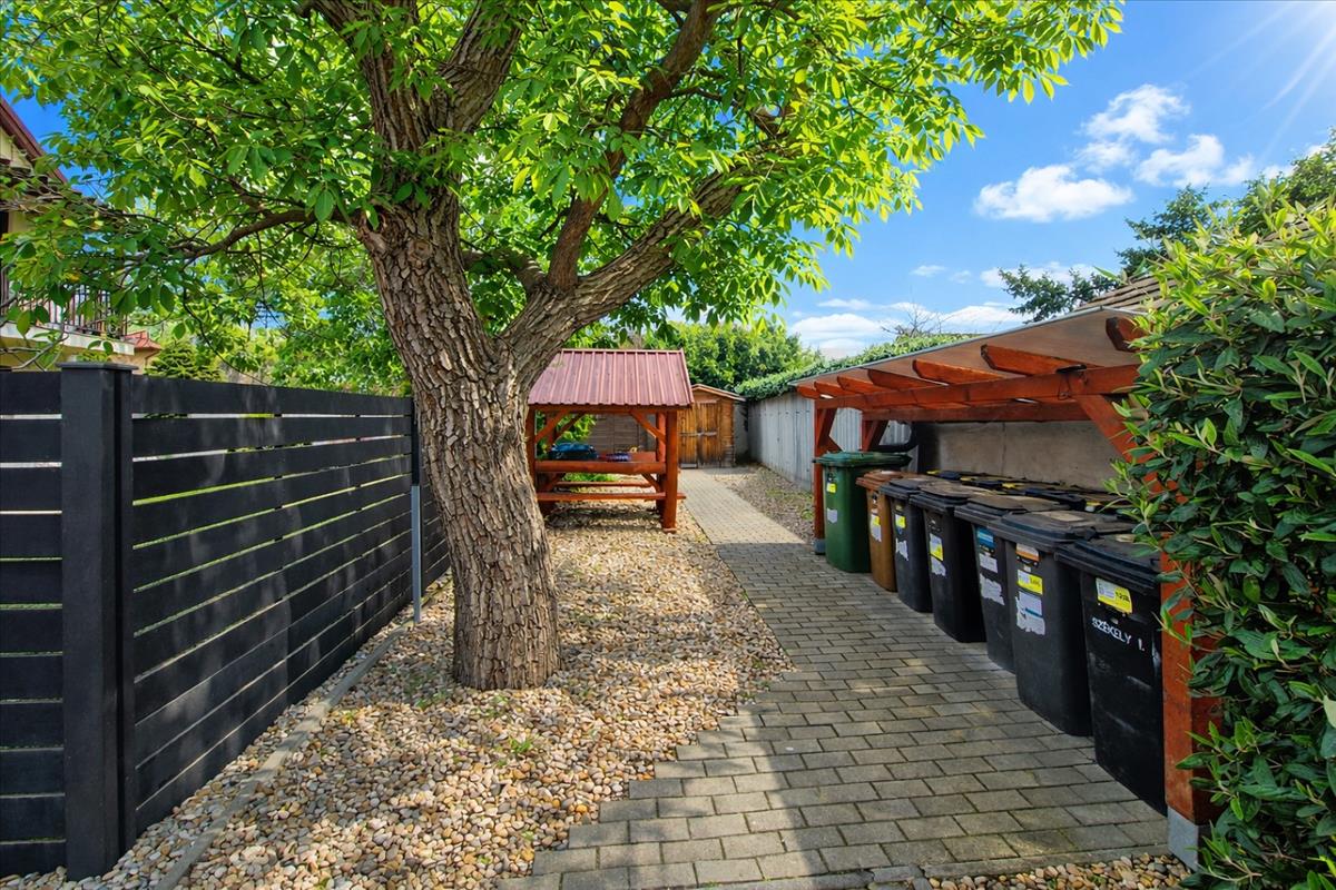 A kis közös udvar diófával és kerti kiülővel tovább erősíti az otthonos, barátságos hangulatot.