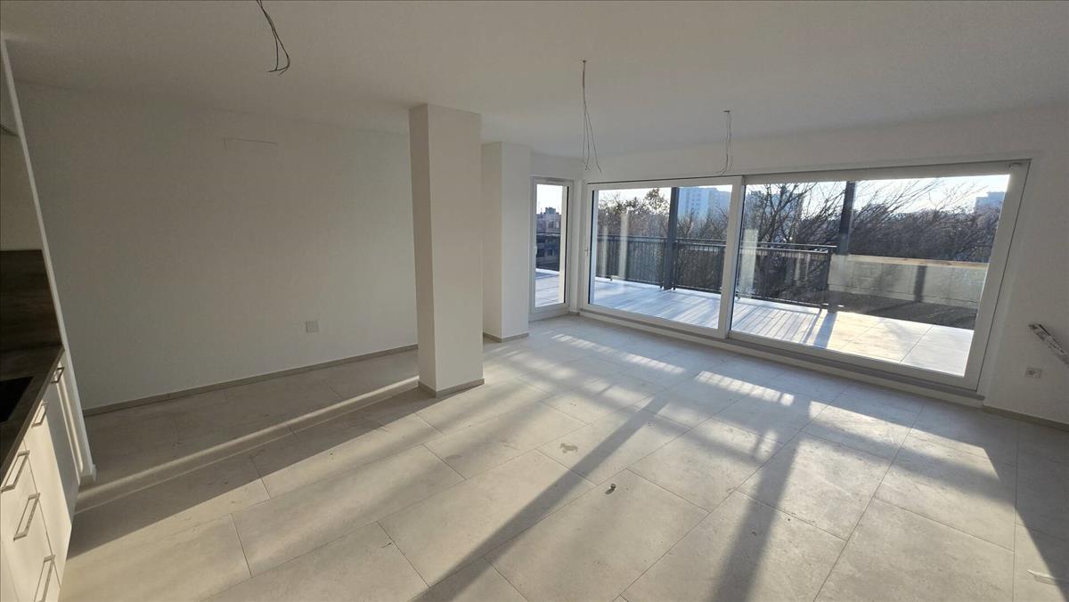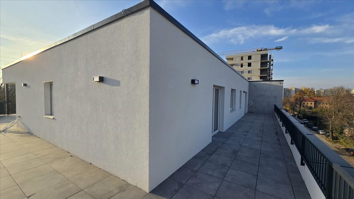 A 137 m²-es terasz igazi ékköve az ingatlannak: tökéletes helyszín napozáshoz, baráti összejövetelekhez vagy egy nyugodt reggelihez a város panorámájával a háttérben.