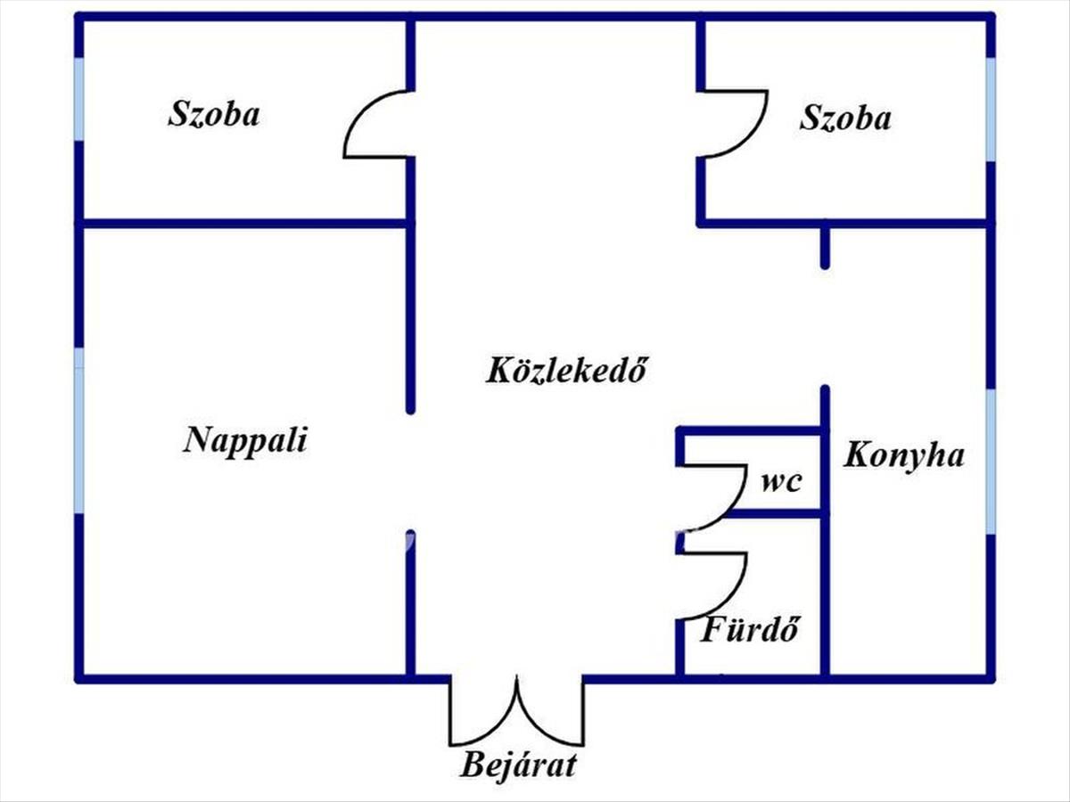 A nappali és a két hálószoba egymástól függetlenek, és a közlekedőből nyílnak. a wc és fürdő külön helyiségben vannak.