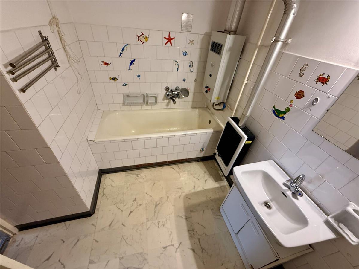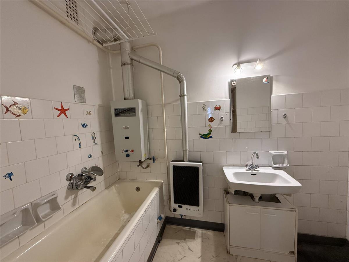 kádas fürdőszoba átfolyó rendszerű vízmelegítővel, fali fűtővel