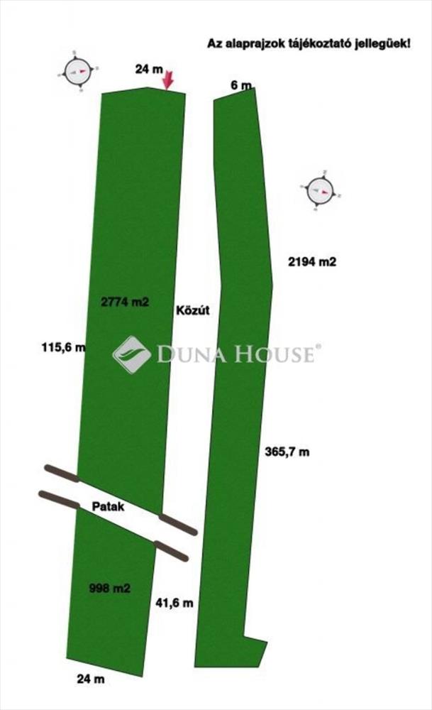 A 998 m2 és 2774 m2 telkek egymásba fonódnak, úgy, hogy egy patak választja el őket egymástól.